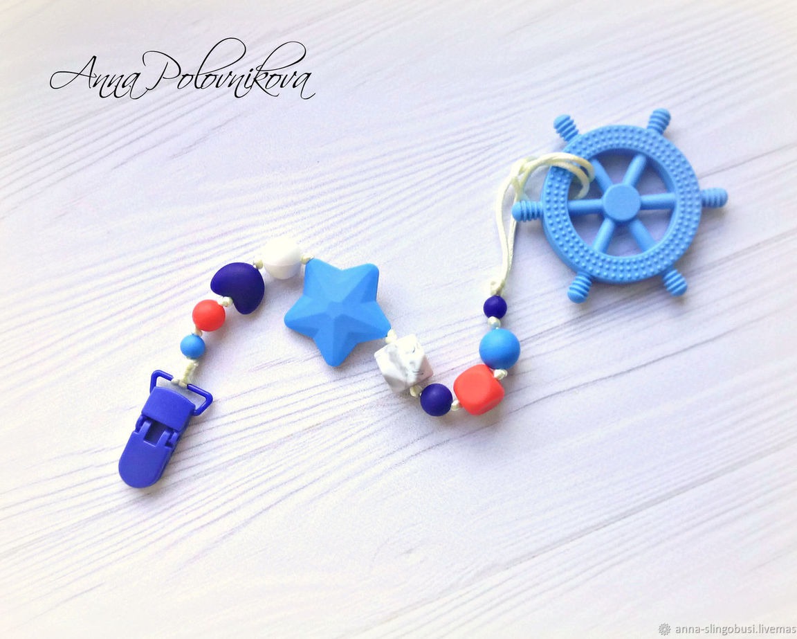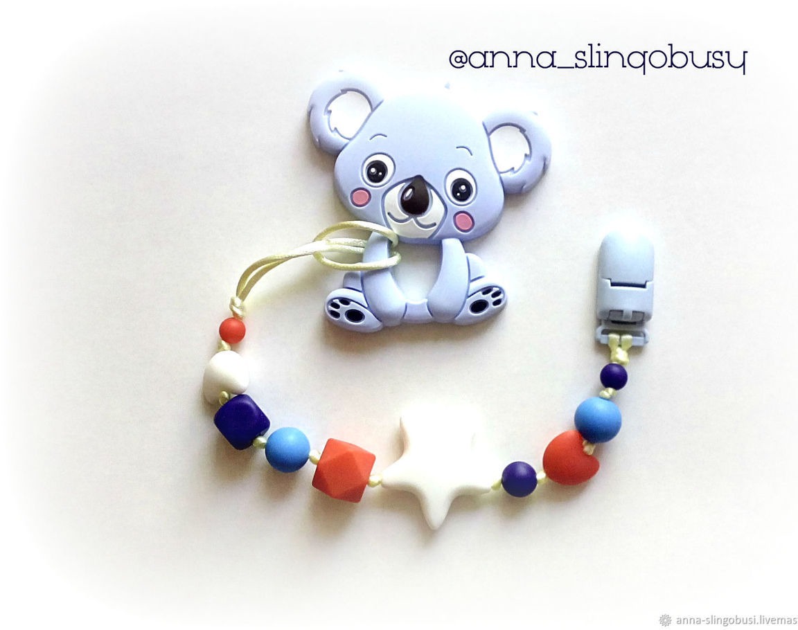 Все детали и бусины произведены из пищевого сертифицированного силикона и собраны на прочный нейлоновый шнур. Пластиковая клипса хорошо держит, ее можно открыть даже одной рукой. Силиконовые детали очень приятно грызть малышу в период прорезывания зубиков, т.к. силикон достаточно мягкий, но одновременно с тем упругий, поэтому малыш ничего не разгрызет.