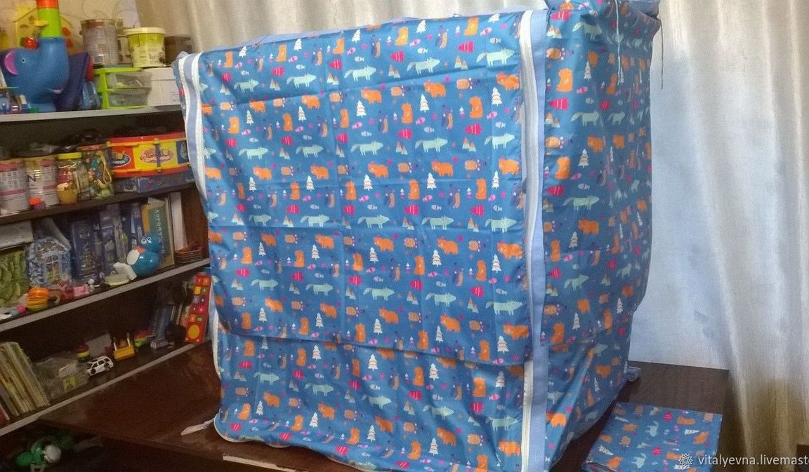 Размер 90х60х90 по опыту уменьшен со 100 см., так как в старых и новых вагонах, и вагонах купе разные расстояния и крепление полок, поэтому иногда 100 см. в высоту получаются впритык к верхней полке, иногда не внатяг, да и для большей проходимости воздуха лучше, а 100 см в длину мешают проходить между манежем и столом(манеж крепим не к окну, а к проходу, чтобы была возможность сидеть за столом).