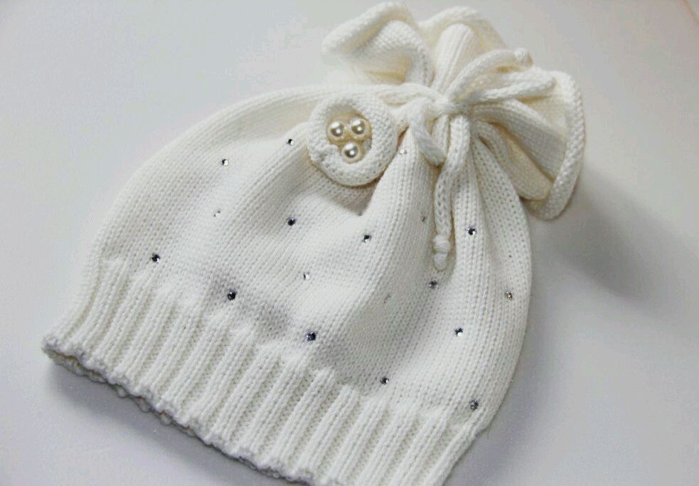 Шапочка связана из полушерсти. Стоимость указана на возраст 1.5 годика. Пряжа мягкая не колится. Возможны разные расцветки. В качестве декора использованы перламутровые бусины и стеклянные стразы.