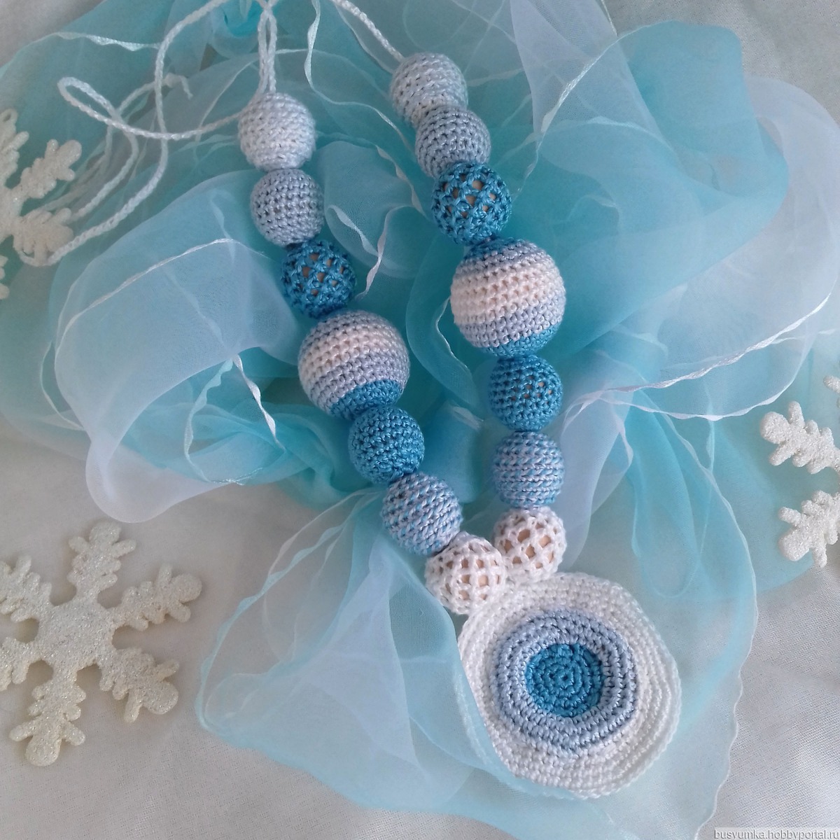 От этих бус так и веет зимней прохладой. А интересный кулон в центре очень удобно грызть маленькому пассажиру на руках. Ведь в центр кулона вшито деревянное кольцо.