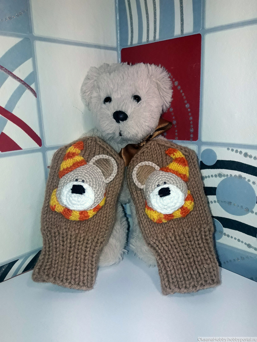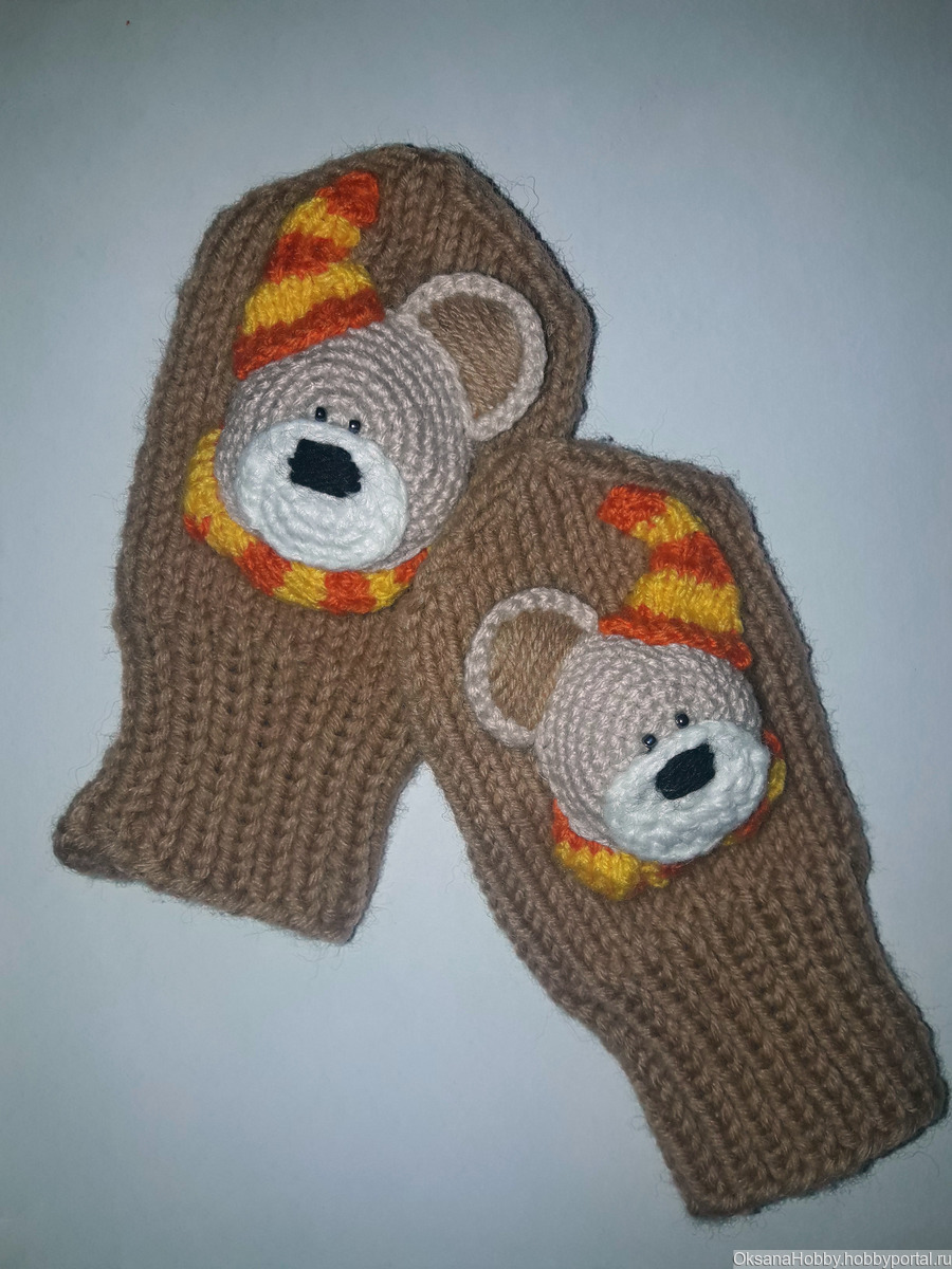Детские вязаные варежки с мишками. Высота 14 см. Ширина 6,5 см. Пряжа: 50% - шерсть, 50% - акрил. Подойдут на 2 года. Порадуйте своих деток красивым аксессуаром.