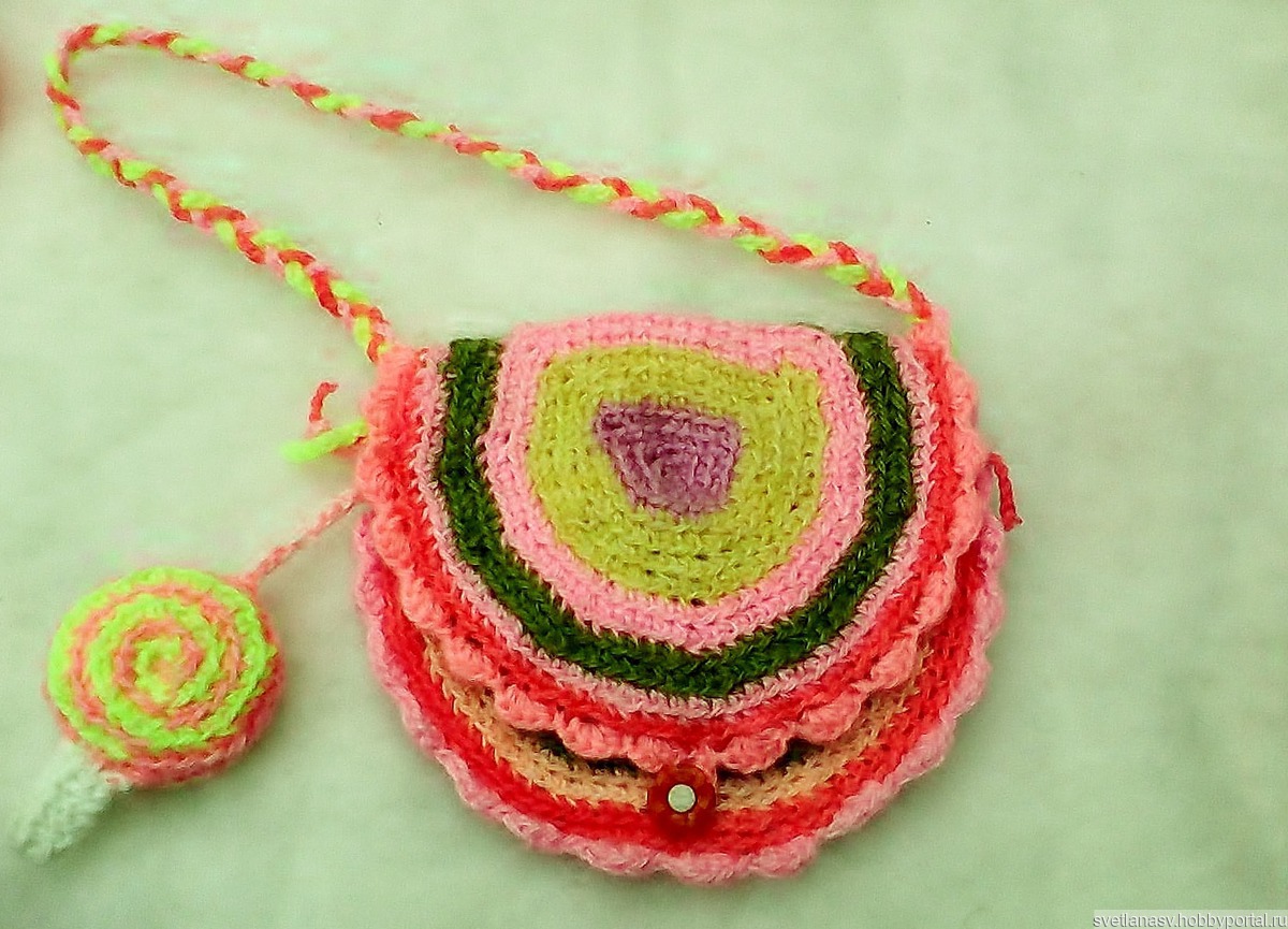 Вязаная сумочка со "вкусными" оттенками сладких карамелек, к сумочке вывязано украшение в виде леденца на палочке.