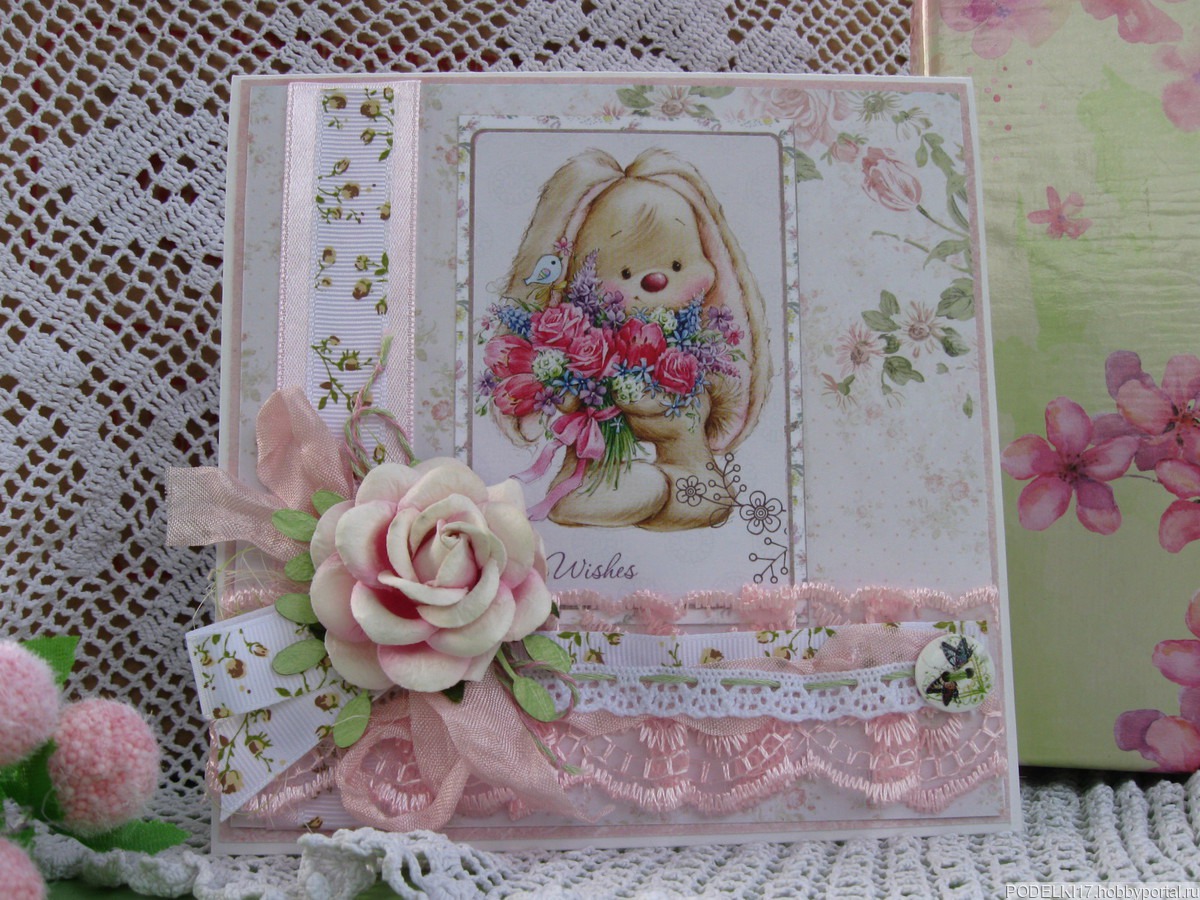 Открытка выполнена с использованием различного кружева атласной репсовой и шебби лент.