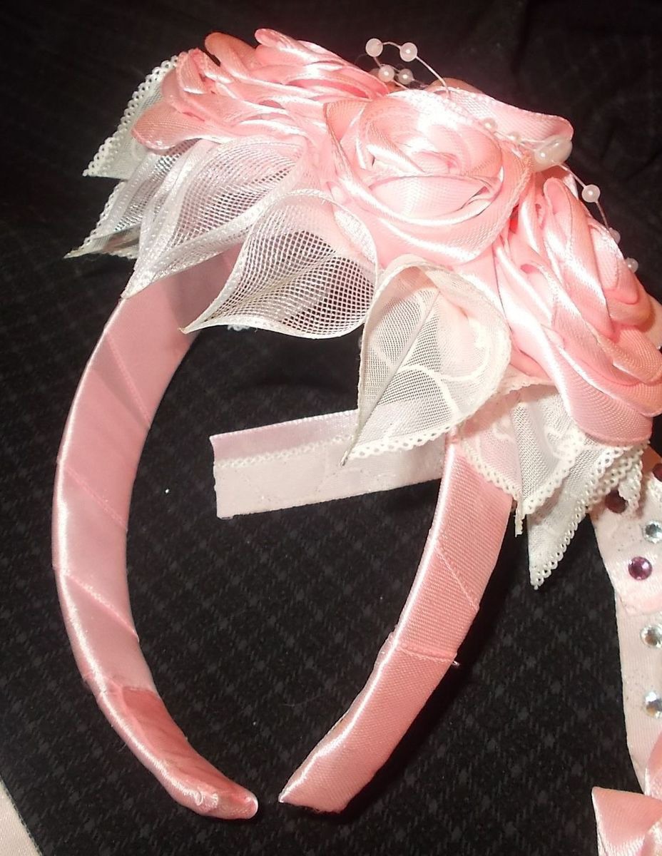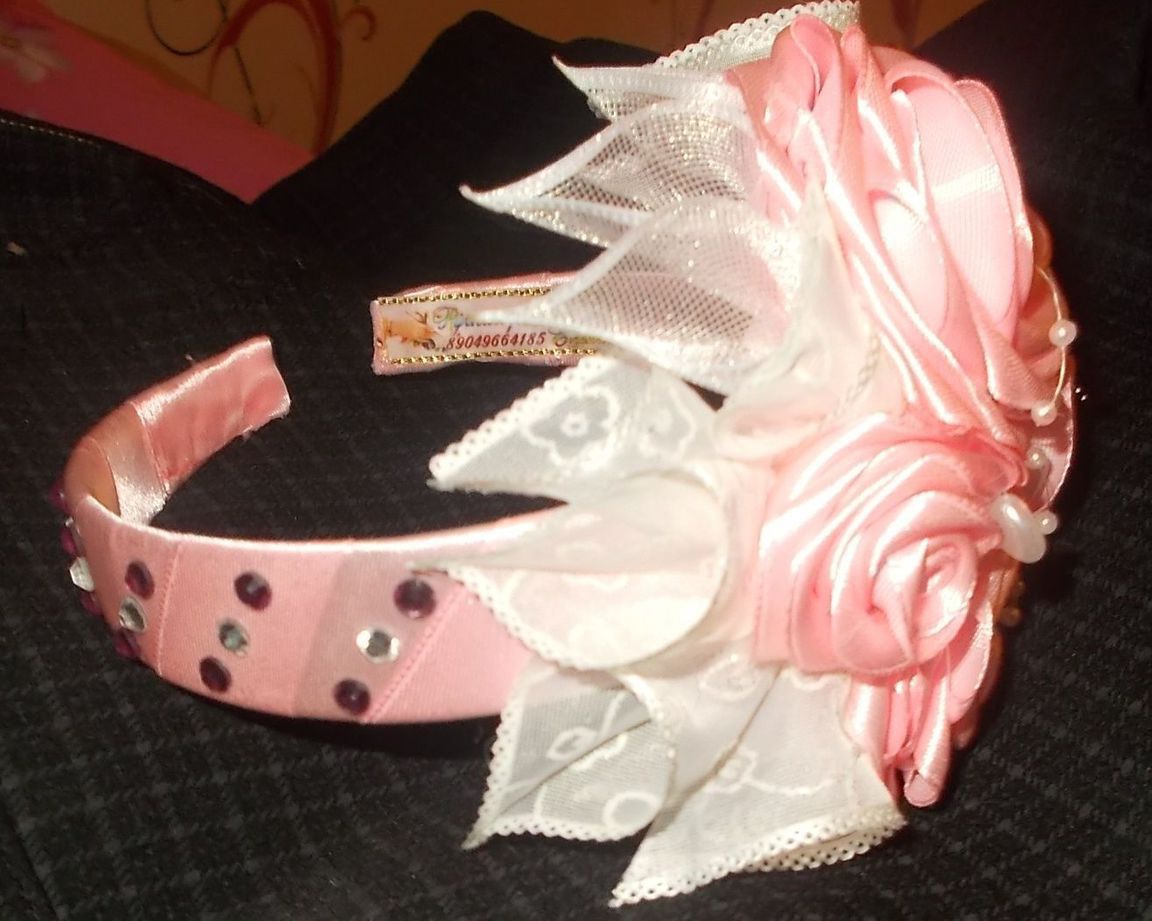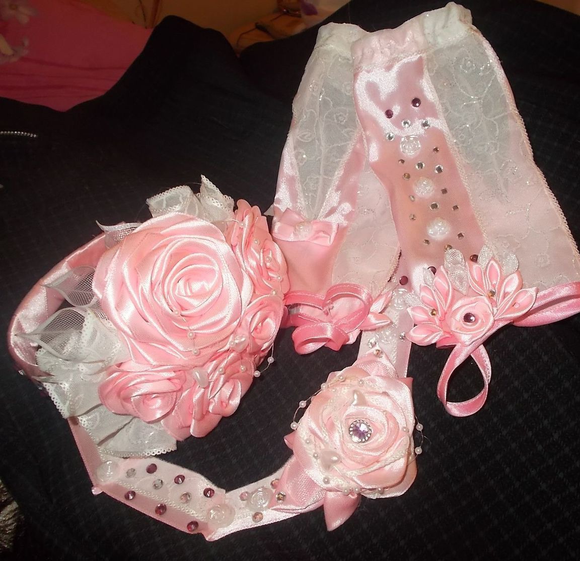 ободок, оригинальный подарок, комбинированный, красивый, украшение канзаши, набор ручной работы, нежнейший розовый, перчаточки, колье канзаши