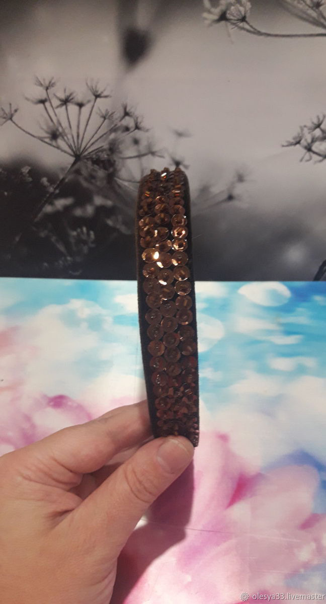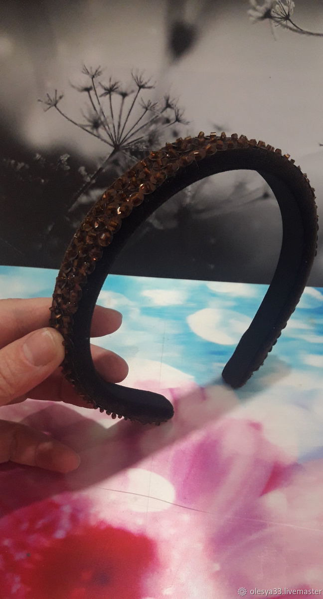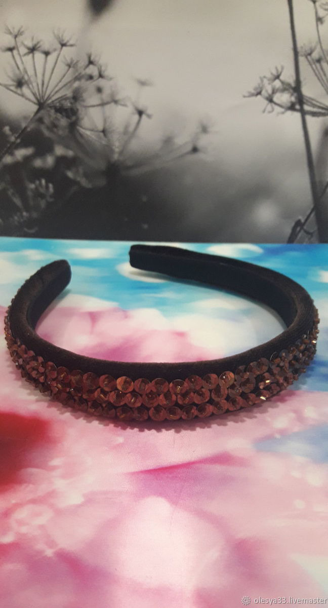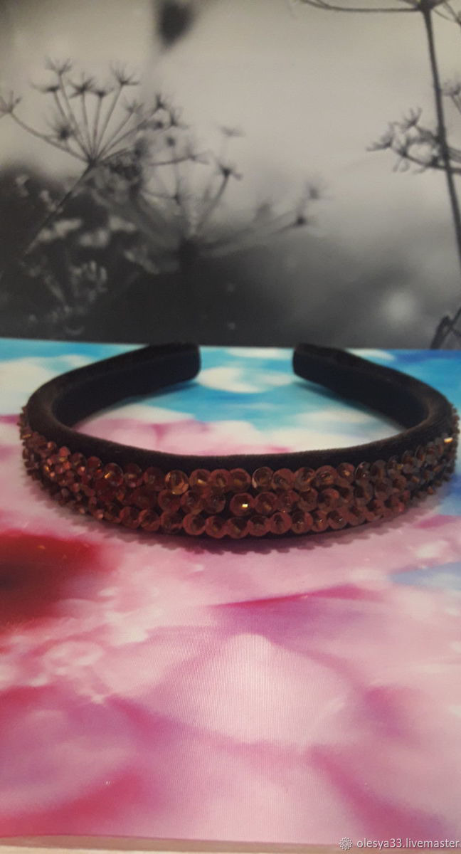 Ободок женский,бархатный узкий,расшитый пайетками и бисером.Отлично смотрится,хорошо держится.