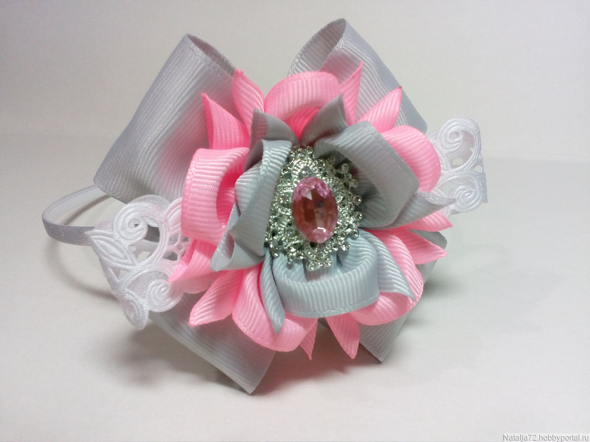 Ободок из репсовых и декоративных лент с ювелирной серединой - отличное украшение для волос в школу и на праздник. Возможно исполнение в другой цветовой палитре, а также в комплекте с резиночками или заколками.