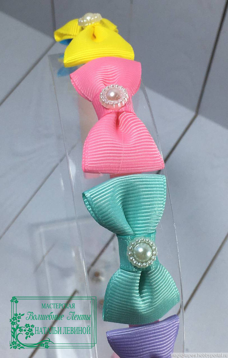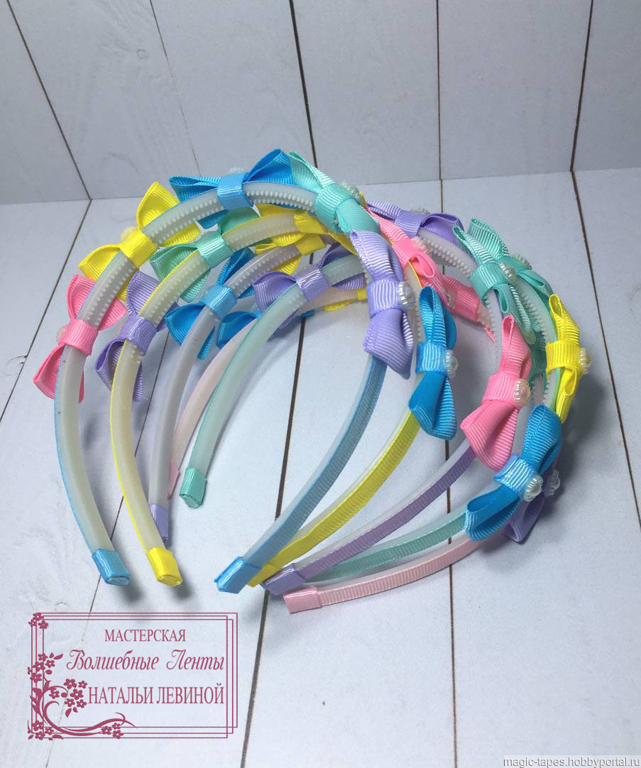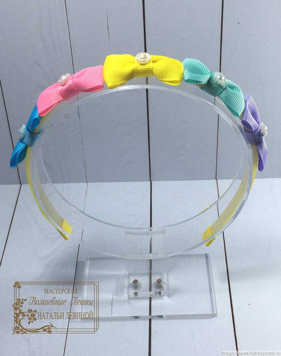 Яркий ободок ручной работы с разноцветными одноярусными бантиками создаст веселое и озорное настроение, будет прекрасным дополнением детского наряда. Бантики на всех ободках одинаковые и украшены фигурной полубусиной. Цветом отличаются только сами ободки. Для их декора использована репсовая лента розового, сиреневого, голубого, желтого и мятного цветов. Ободок имеет подарочную упаковку, что позволит Вам сразу преподнести его в подарок подруге, сестре, дочке или внучке. Также есть более плотная коробка для сохранности при транспортировке.