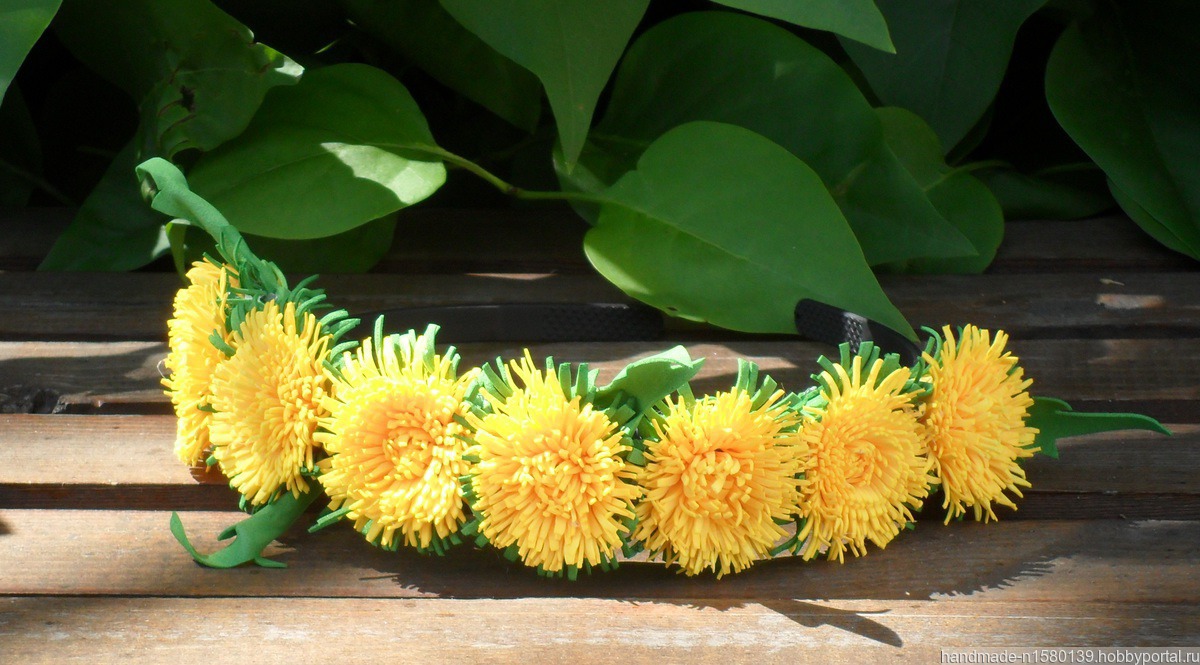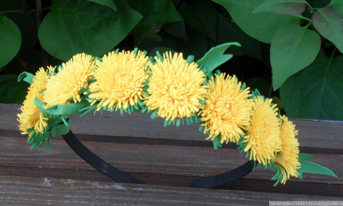 Все помнят детство и лето, когда девочки плели венки из одуванчиков, но к сожалению такой венок быстро увядал. Вашему вниманию предлагается венок из одуванчиков, который не завянет. Венок может использоваться для фотосессий. Выполнен на основе ободка для волос.