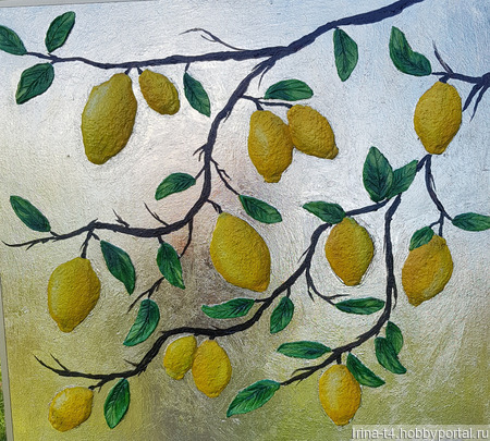 картина для интерьера, картина в подарок, золотистый, поталь, барельеф, лимоны акрилом