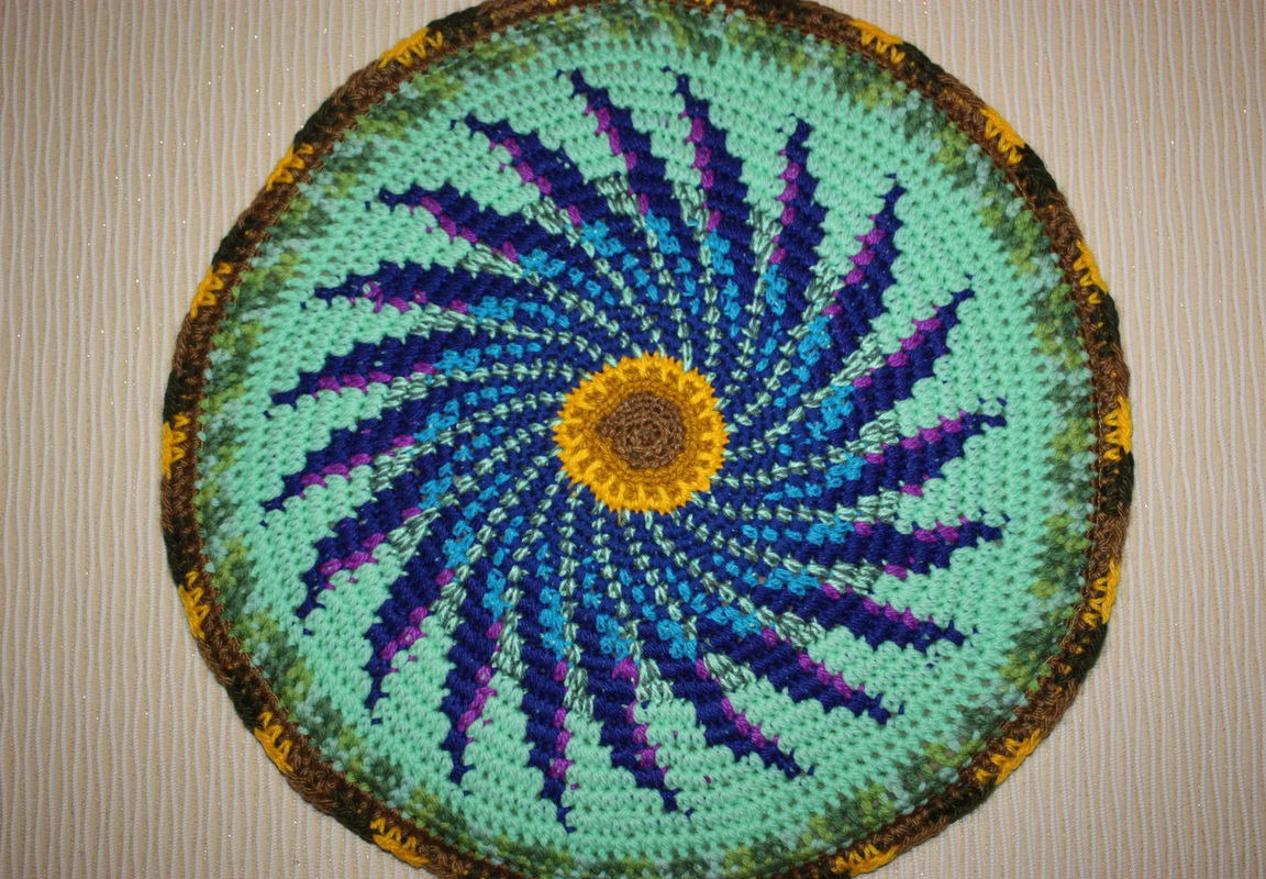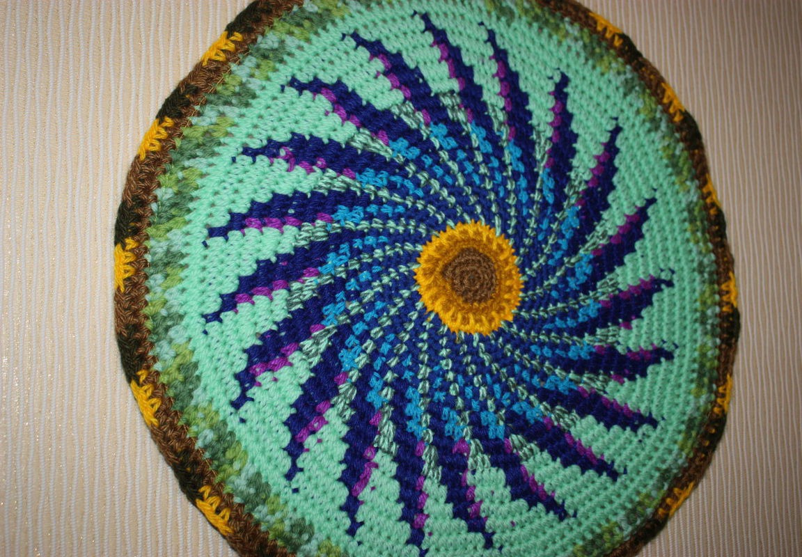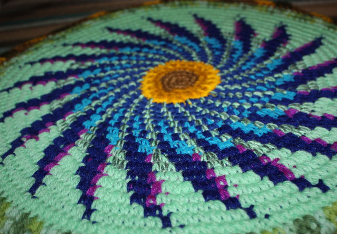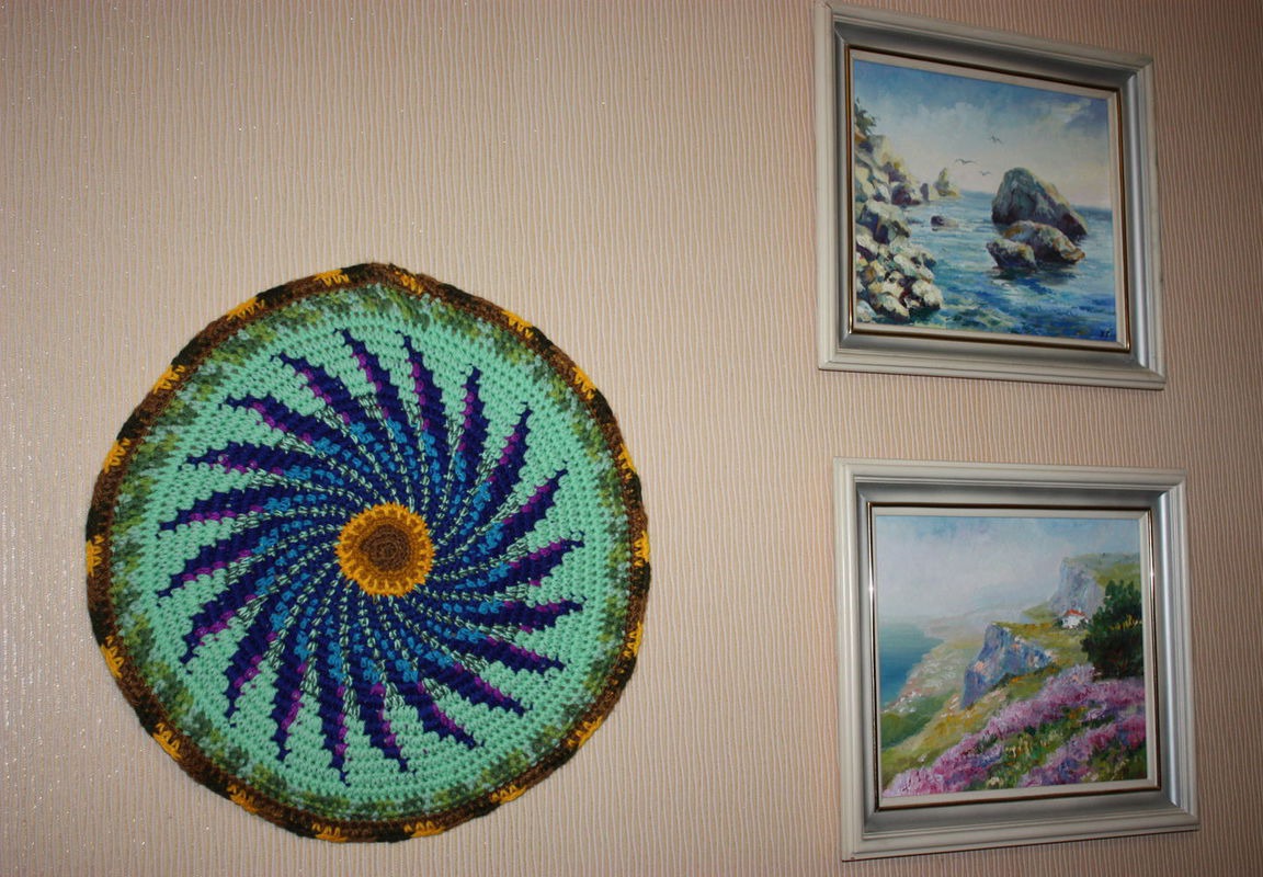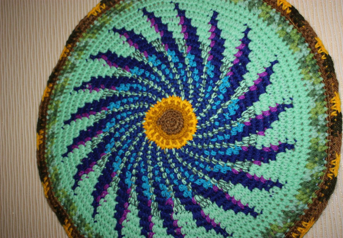 Коврик вязаный крючком из цветной полушерстяной пряжи, двусторонний. Нижняя сторона - флис. Внутри тонкий поролон. Коврик удобен для прогулок на природе. На нем тепло и мягко сидеть на лавочке, на скамейке. Можно украсить ним салон автомобиля или компьютерное кресло. Может быть самостоятельным элементом интерьера, создаст настроение и уют в доме.