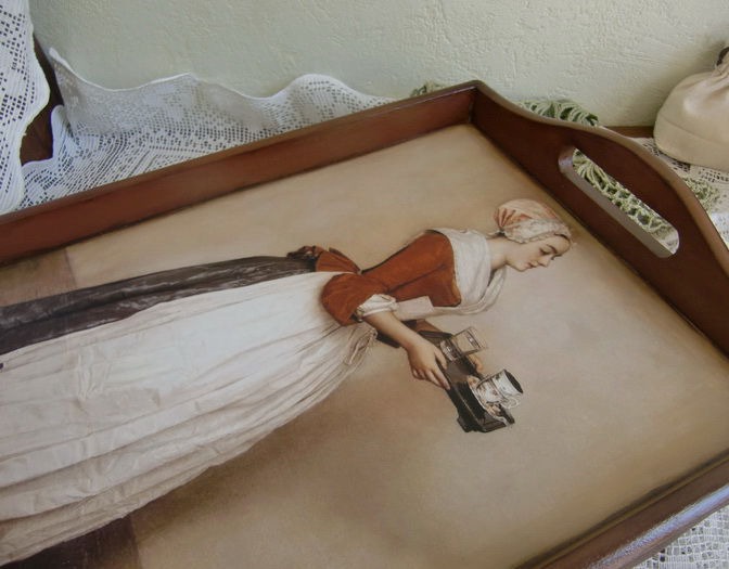 Деревянный поднос выполнен в технике декупаж с объемными элементами на бортиках.
