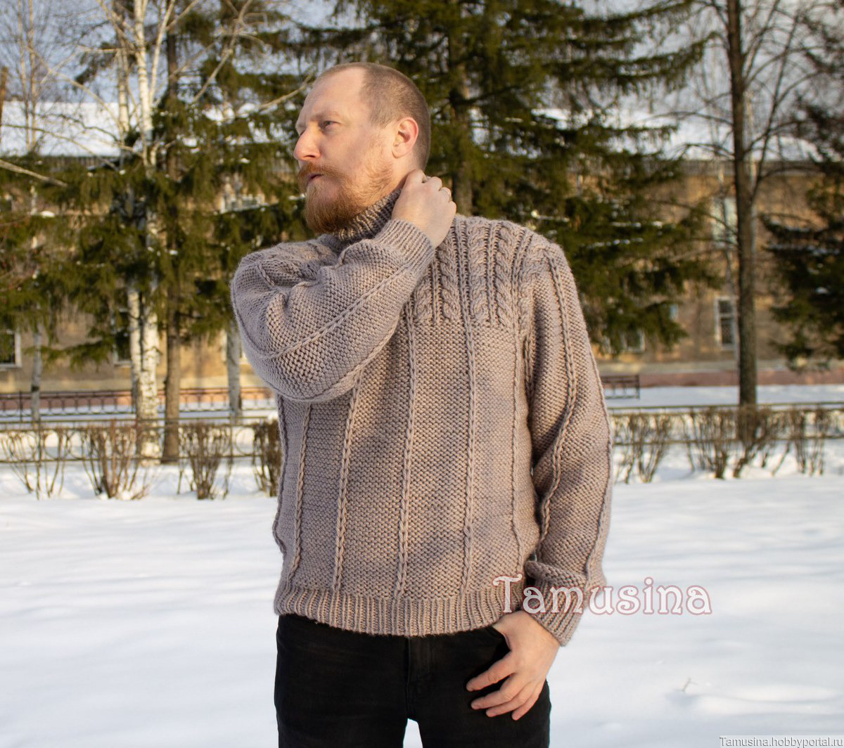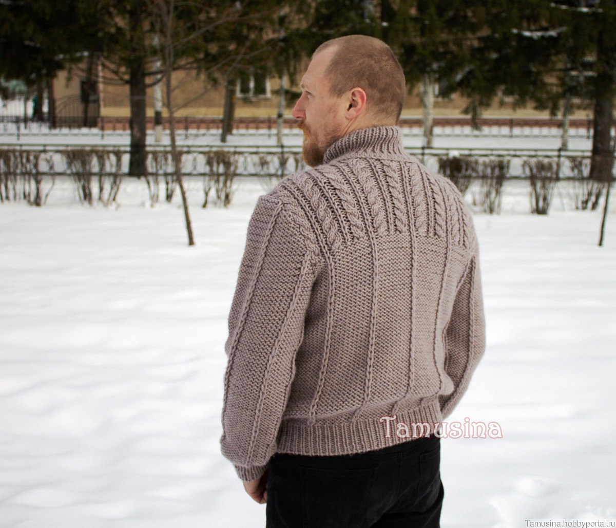 Через перед, спинку и рукава проходят вертикальные цепочки петель, зрительно вытягивающие силуэт. Жгуты-араны, расположенные в верхней части переда и спинки, наоборот, делают плечи шире. Это придаст владельцу свитера мужественности и стройности. Высокий воротник – надёжная защита от ветра.