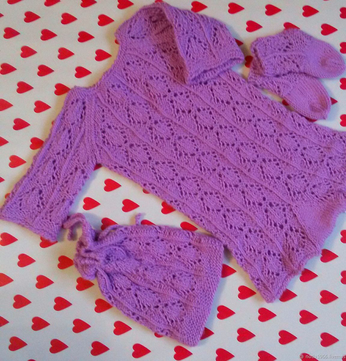 Ажурный вязаный комплект для новорожденного , состоит из боди, шапочки и носочков, связан из специальной детской пряжи (40%шерсть, 40%акрил, 20%бамбук) на ощупь мягкий и шелковистый, хорошо пропускает влагу и воздух, комфортный в любое время года.