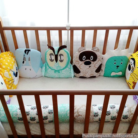 Еще одни бортики с Винни Пухом и всей компанией, яркие и позитивные. На заказ. Отдельная подушка-зверушка стоит 550-600 руб.