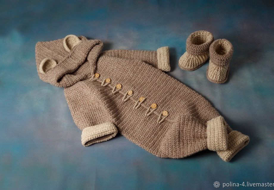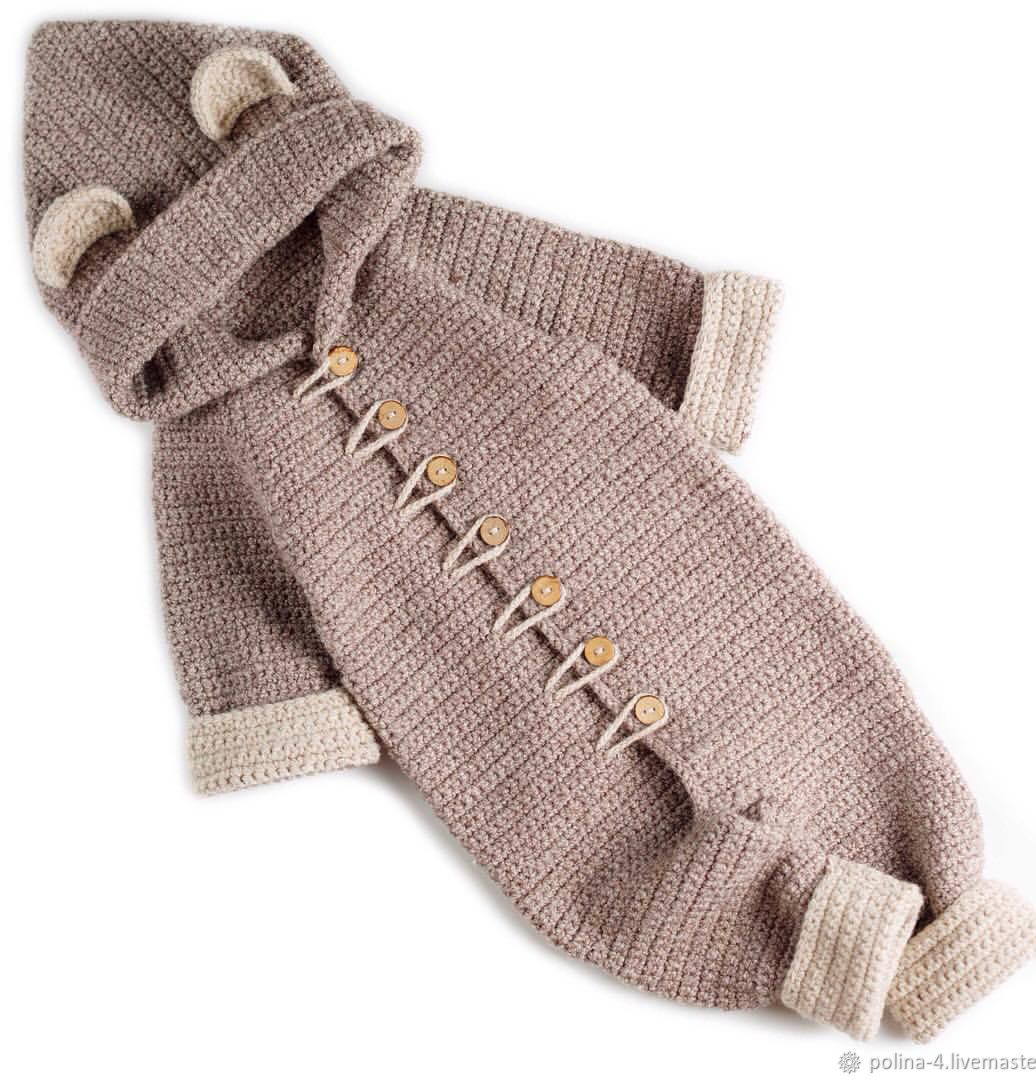 Детский полушерстяной комбинезон, очень теплый и мягкий, согреет кроху в любую непогоду. К комбинезону можно добавить любые аксессуары, а также можно изменить форму ушек и добавить пинетки.
