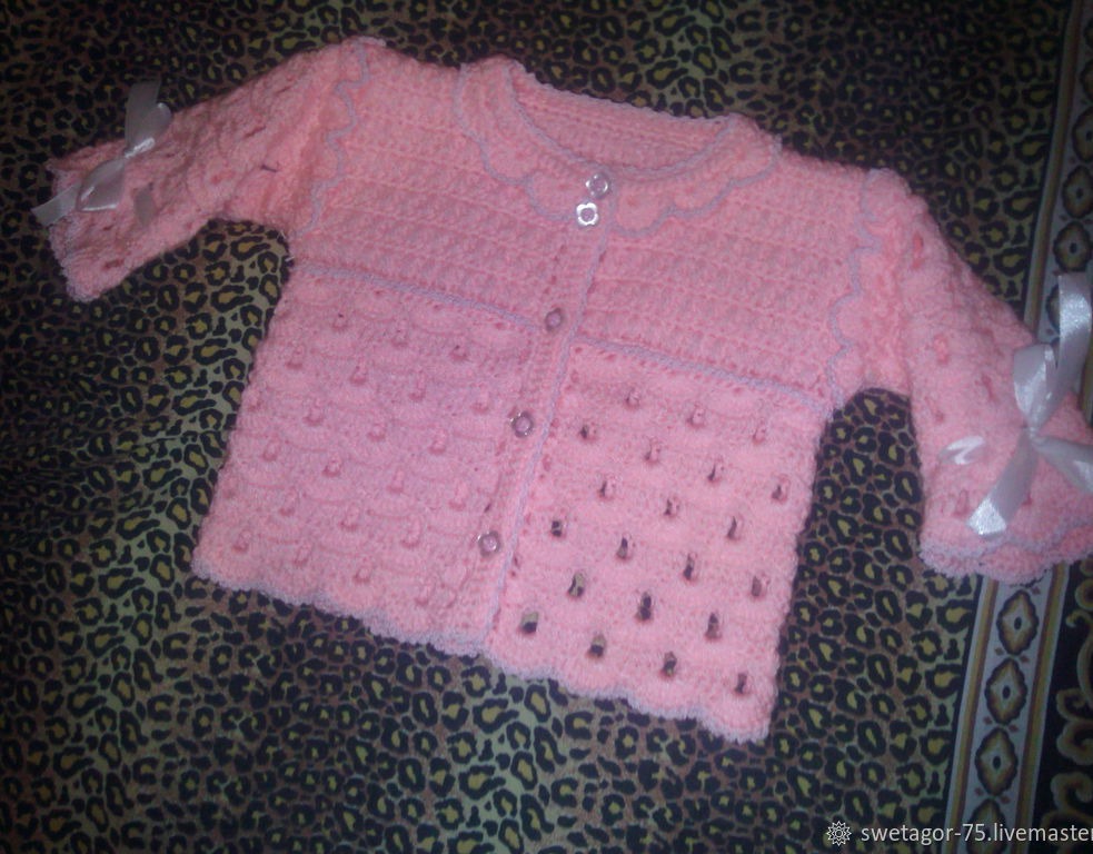 Кофточка для малышки связана крючком из мягкой детской пряжи и украшена атласными лентами и нежными пуговками.