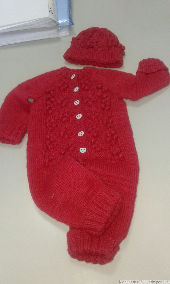 Теплый комбинезон в комплекте с шапочкой с вишенками. Связан из турецкой пряжи. Состав Акрил. Мягкая пряжа для детской одежды.