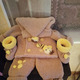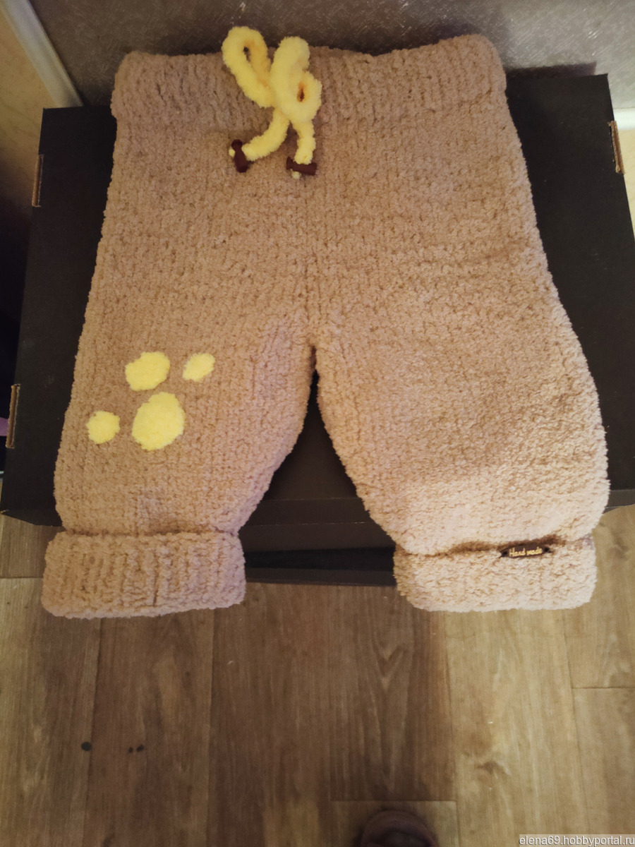 Комплект для мальчика на 9-12 мес из 3 предметов. Кардиган с капюшоном, двубортный, украшен аппликацией. Штанишки так же с аппликацией, сверху регулируются шнурком. Пинетки так же со шнурочком.