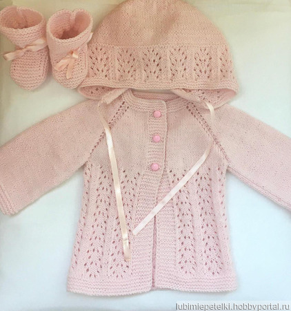 В комплект входит: кофточка с застежкой на пуговки, шапочка и пинетки.