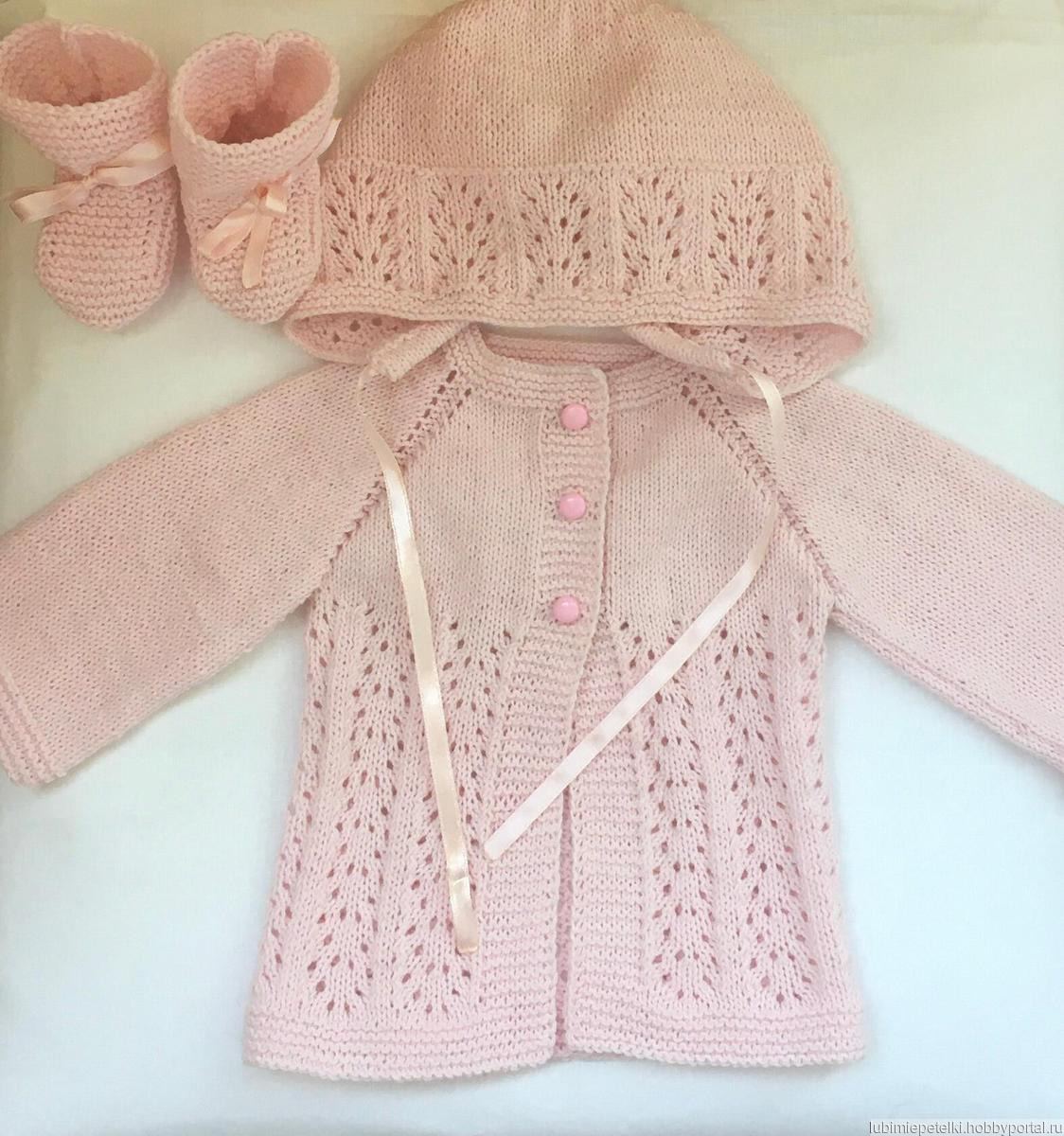 Комплект для новорожденной малышки. Размер 56-58. Выполнен из турецкой пряжи (50% хлопок, 50% акрил) нежно-розового цвета.