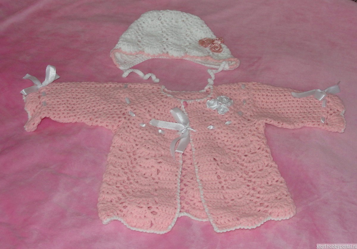 Комплект для новорожденного состоит из ажурной кофточки и чепчика связаны крючком из детской пряжи оформлено атласной лентой и розочками - выполню в любом цвете из любого вида пряжи