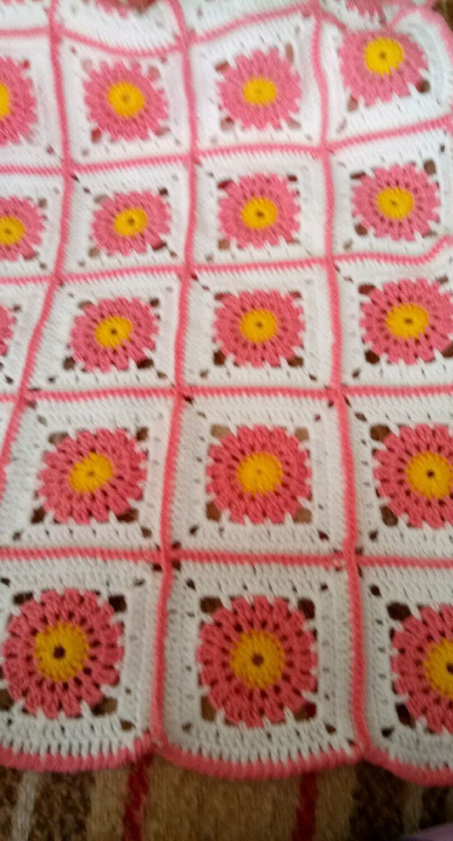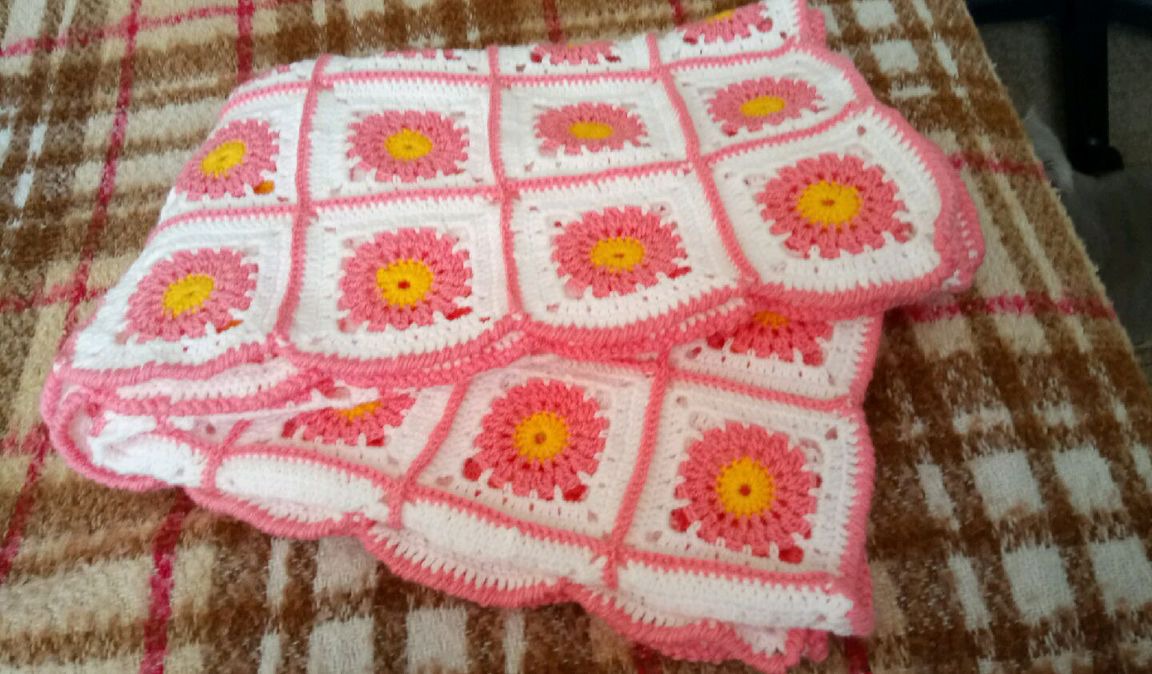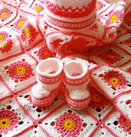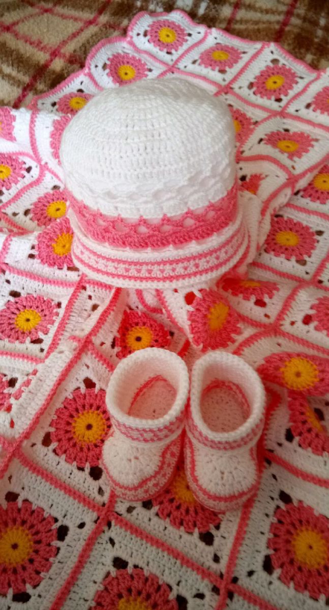 Этот чудесный комплект станет прекрасным теплым подарком для новорождённой девочки. В комплекте плед, связанный мотивами, шапочка и пинетки. В работе использованы акриловые детские нитки, не вызывающие аллергию на шерсть. очень мягкий и теплый плед станет согреет теплом Вашего малыша.