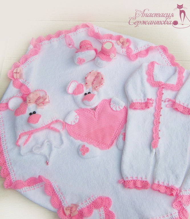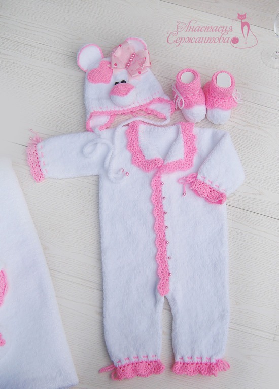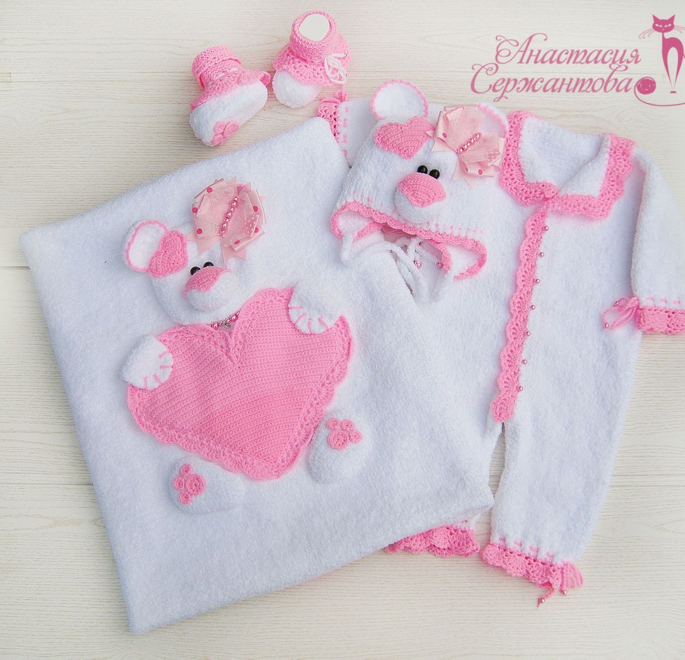 белый, вязание на заказ, ручная работа, розовый, вязаный комбинезон, вязаный плед, для девочек, на весну, на осень, комплект на выписку, мишка тедди, анастасия сержантова, Шикарный комплект на выписку, Для малышек, Комплект тедди, Вязаные пинеткт