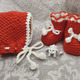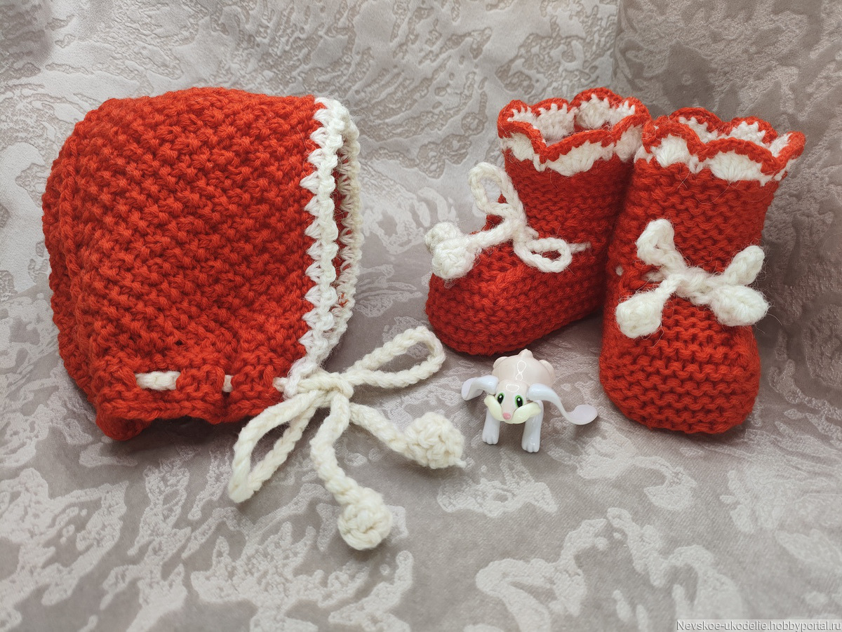 Комплект связан из пряжи ярко красного цвета, который символизирует радость и праздник у очень многих народов. То что нужно для выписки