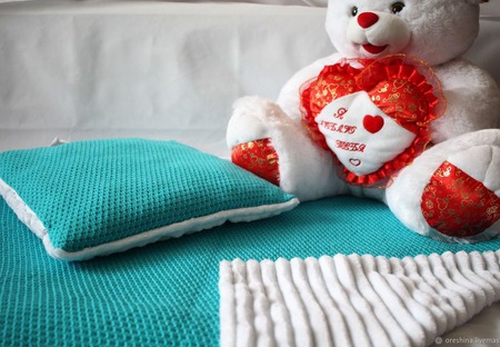 Комплект (плед +подушка) в коляску(кроватку). Очень нежный, мягкий и теплый. Подойдет для прохладной погоды. Наволочка на подушке снимается, что очень удобно для стирки. Наполнитель в подушке гиппоалергенный холофайбер. Возможен повтор в любом цвете.