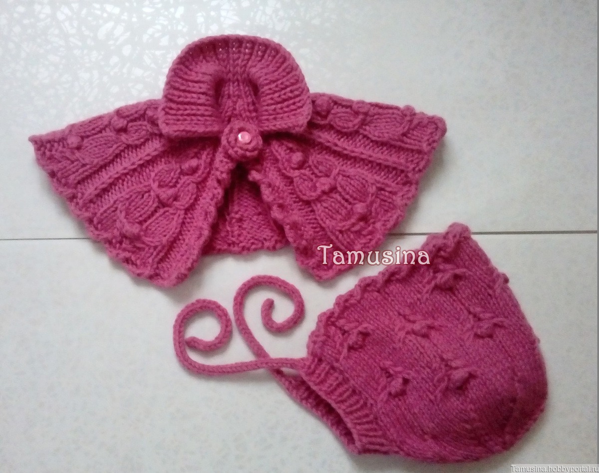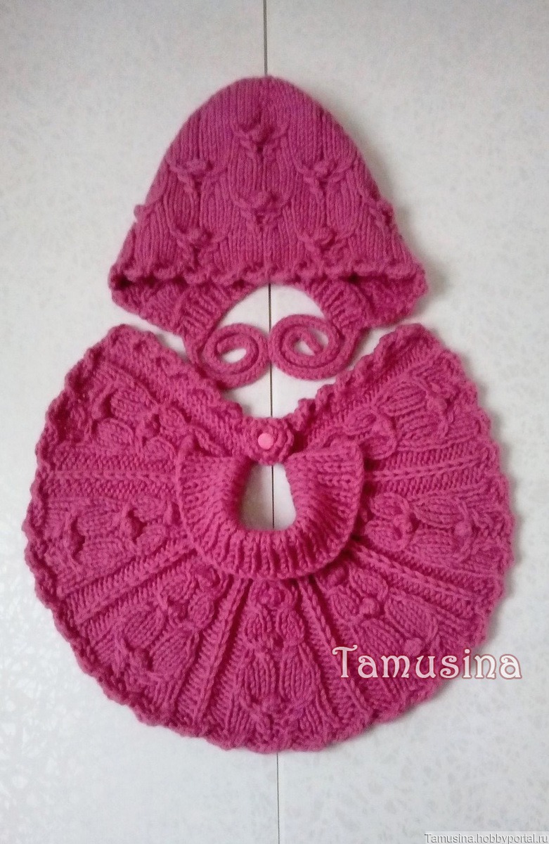 Шапочка-чепчик и пелерина для маленькой девочки связаны спицами из мягкой полушерстяной пряжи. По размеру: на окружность головы 43-47 см, на окружность шеи 25-26 см, на возраст 6-18 месяцев.