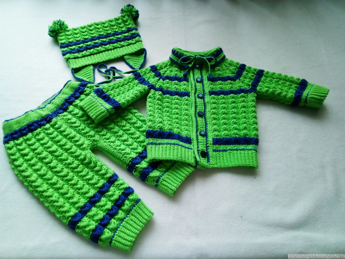 Детские вязаные костюмчики удобны и практичны, за счет своей эластичности они превосходно тянутся и отлично сидят на малыше.