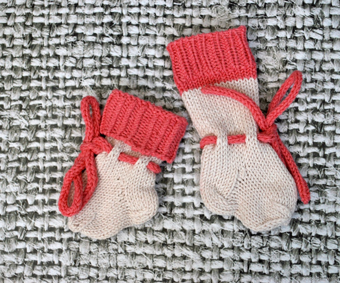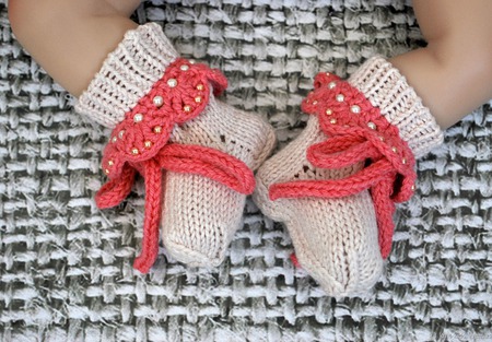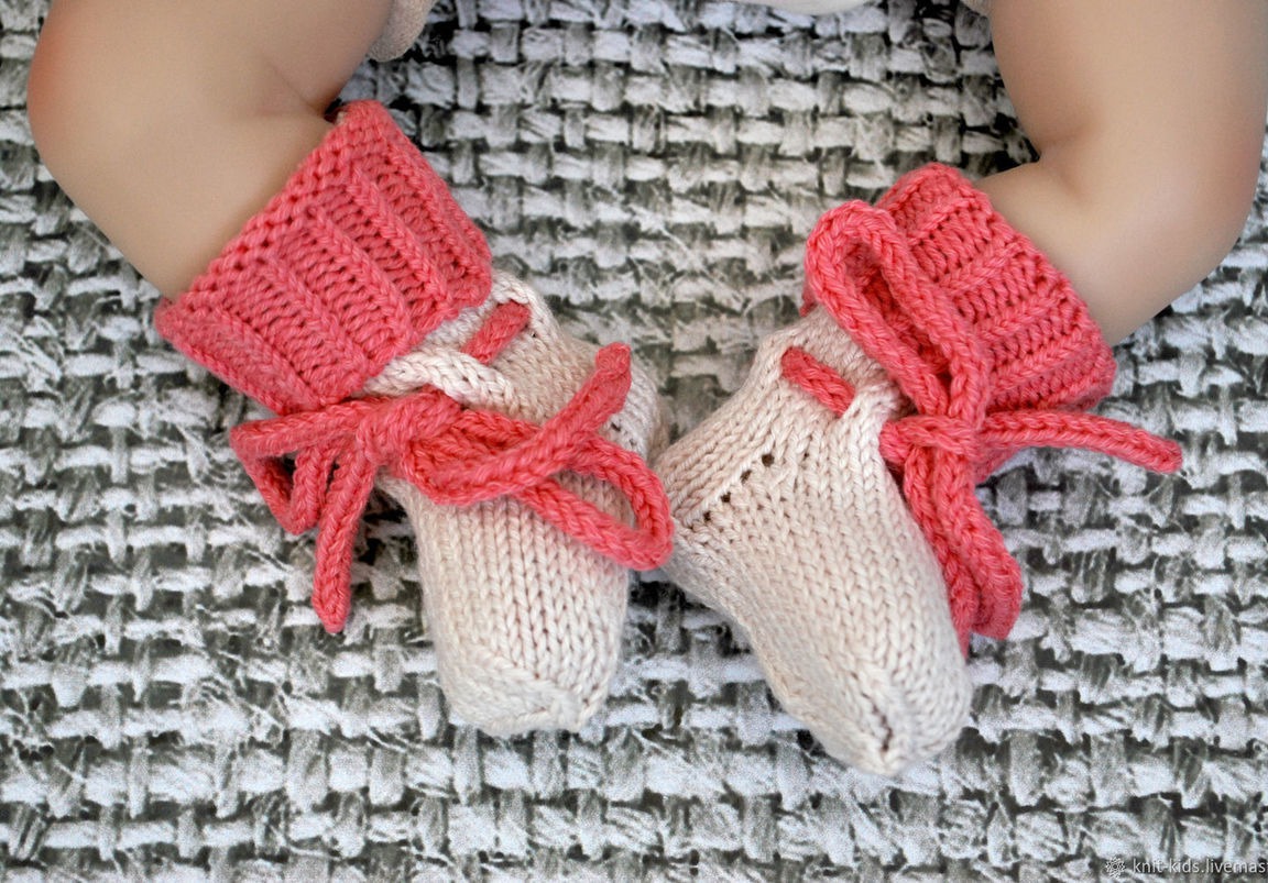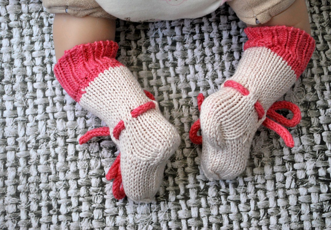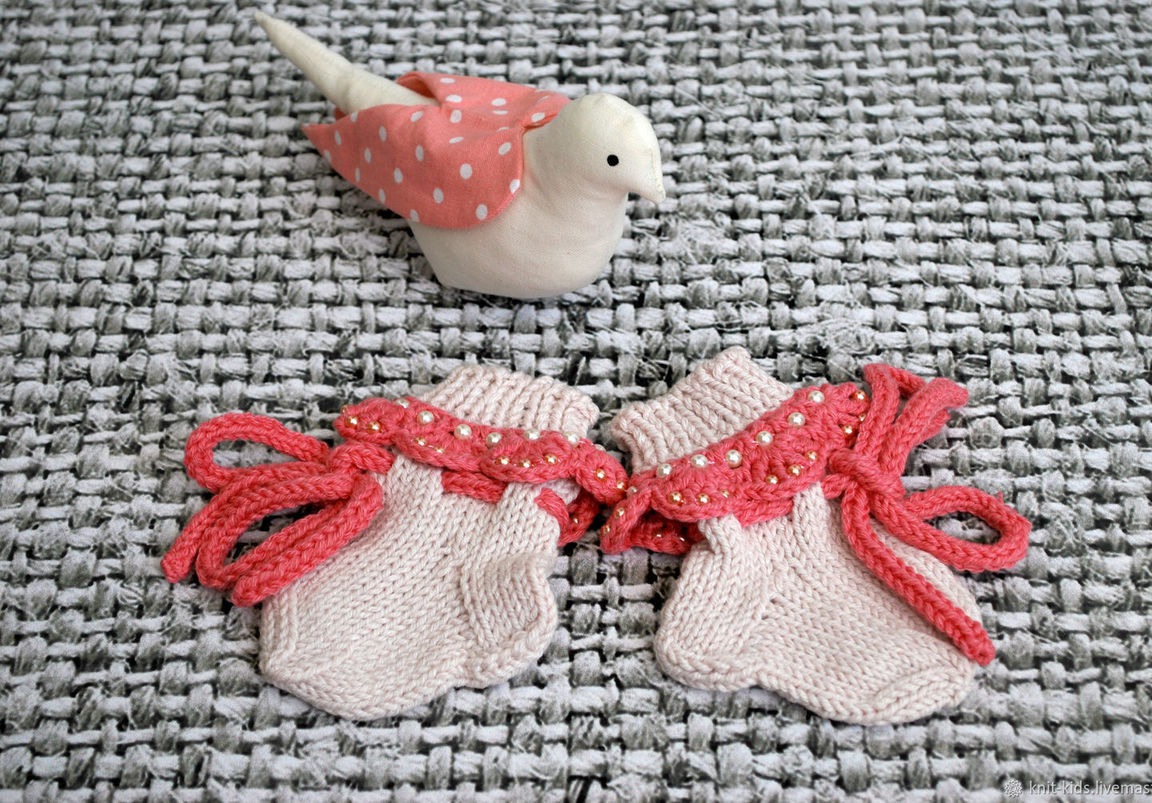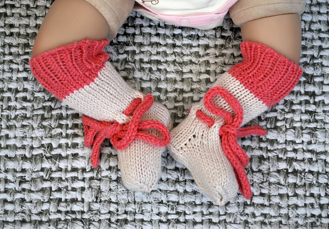 Носочки для новорожденного, два варианта. Первый - нарядный, с кружевной оборкой и отделкой бусинами "под жемчуг". Второй - с высокими отворотами, если развернуть отворот полностью, то носочки превращаются в длинные гольфы. Носочки выполнены из очень мягкой пряжи, совершенно не колются даже при надевании на босую ножку. В составе пряжи 50% шерсти мериноса и 50% хлопка, ни грамма синтетики. Чтобы носочки не спадали, у них есть мягкий вязаный шнурок. Цена указана за одну пару носочков.
