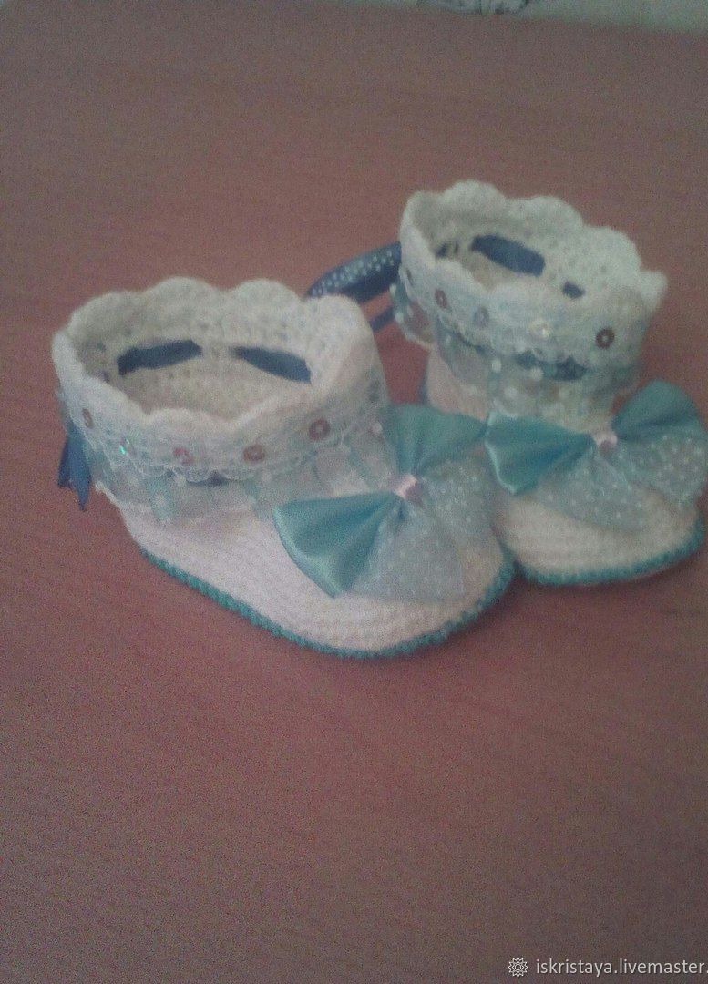 Теплые нарядные пинетки из гипоаллергенной акриловой пряжи. Украшены кружевом и атласной лентой. Согреют ножки вашего малыша и послужат красивым дополнением к праздничному наряду
