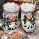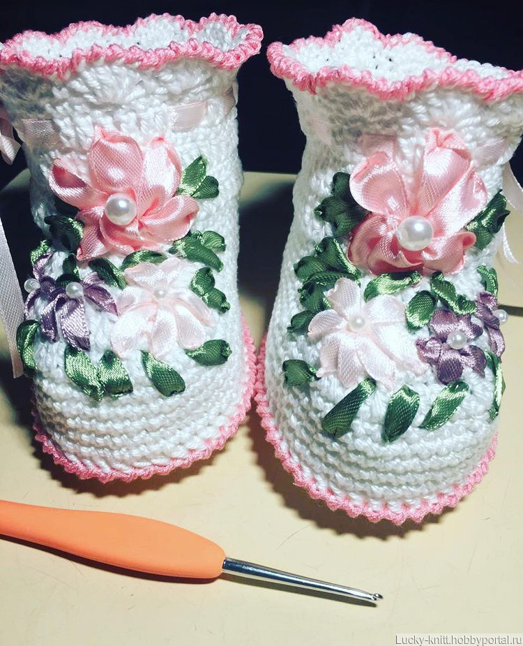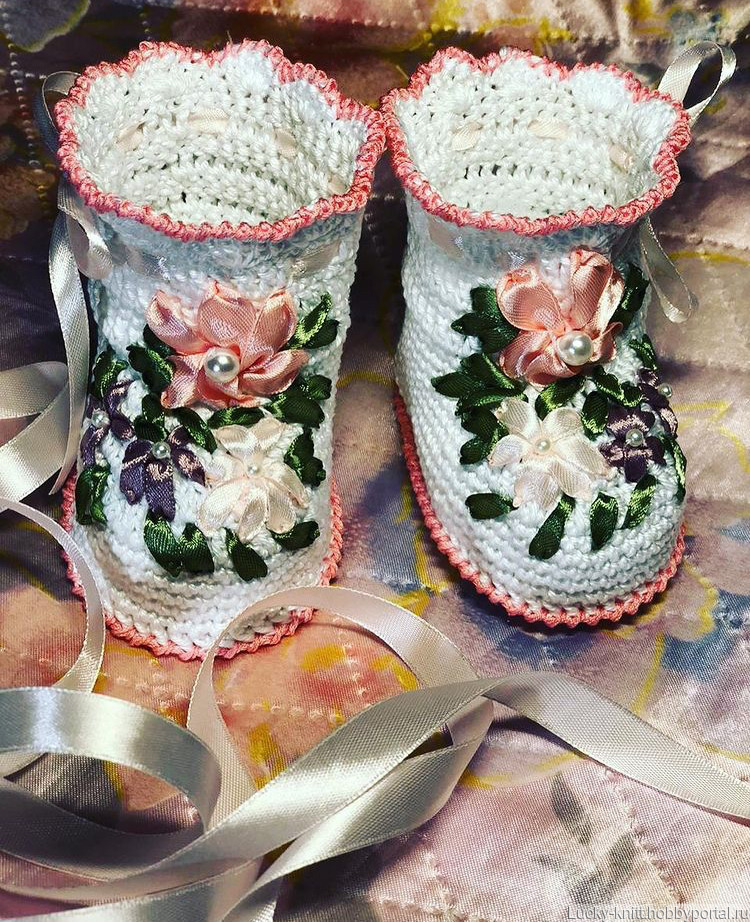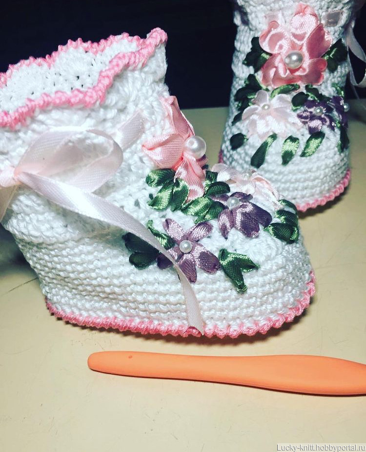 Нарядные пинетки для малышки. Изготовлены из хлопка, вышиты атласными лентами и украшены бусинами. Размер 10 см