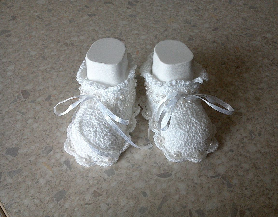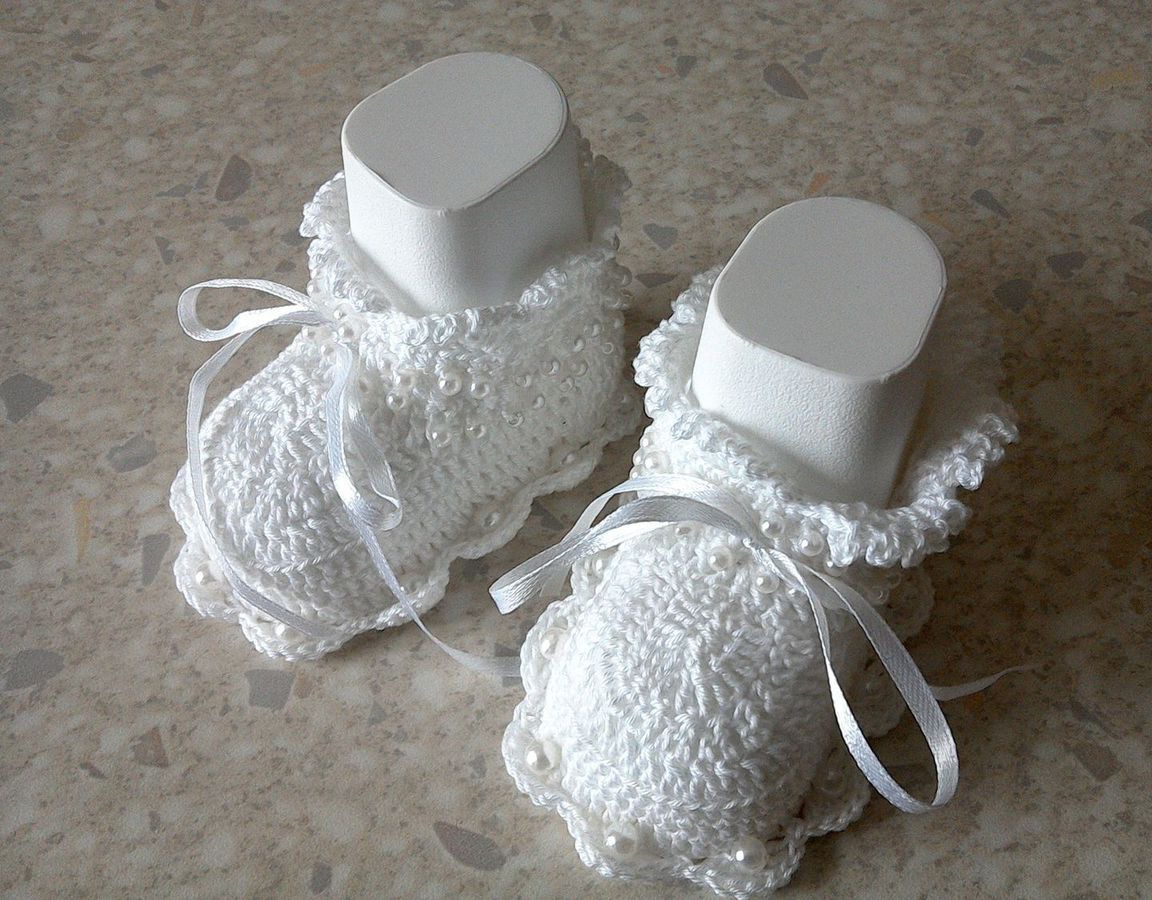 Очень красивые белоснежные пинетки украшены бусинами, связаны из хлопка крючком.