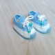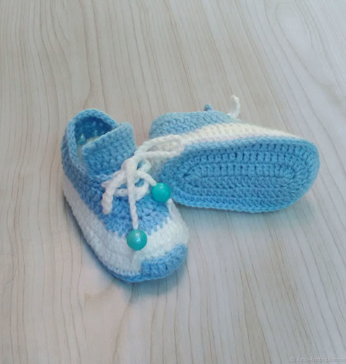 Кроссовочки выполнены из детской гипоаллергенной пряжи, очень легкие, мягкие, теплые. Пинетки анатомической формы, нет ни единого шва! На ножке фиксируются шнурочками, что предотвращает спадывание пинетки. Цвет пинеток : нежно голубой с белым, подойдут как мальчикам так и девочкам.