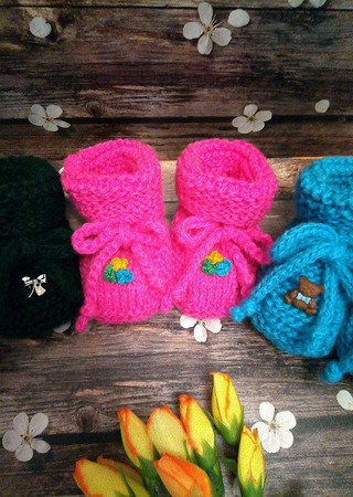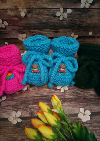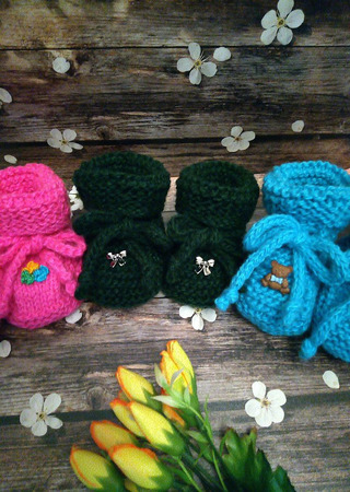 Теплые,яркие и мягкие пинеточки связаны из полушерстяной пряжи,спицами