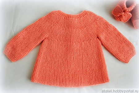 Вязаная спицами распашонка подойдет малышу на возраст от 3 мес до 1 года для прогулок прохладной осенью и зимой. Связана из пряжи Подмосковной 50% шерсть, 50% акрил, застегивается на 3 деревянные пуговки. Длина 27 см, длина рукава (от шеи) 26 см. В комплект к кофточке можно подобрать пинетки по Вашему размеру.