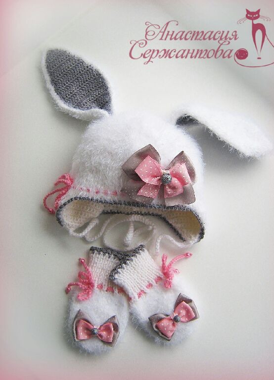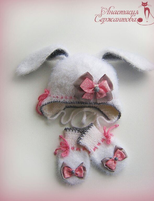 серый, белый, вязание на заказ, ручная работа, зайчик, розовый, для девочек, на весну, на зиму, на осень, для малышей, анастасия сержантова, Комплект зайка, Шапочка зайка, Варежки царапки, Вязаная пушистая шапочка