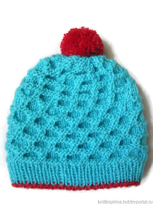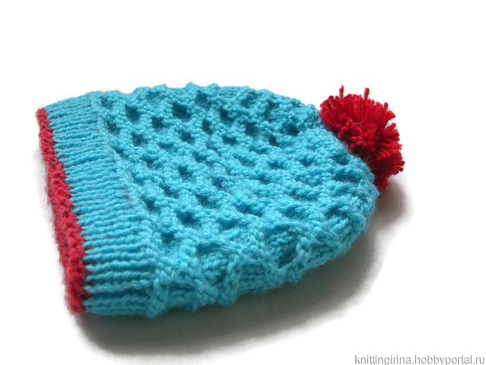 Весенняя шапочка для новорожденного малыша бирюзового цвета с красной окантовкой. Шапочка согреет вашего малыша в прохладный весенний день. Яркий красный помпон делает эту шапку нарядной и веселой. Шапочка будет прекрасным подарком новорожденному ребенку.