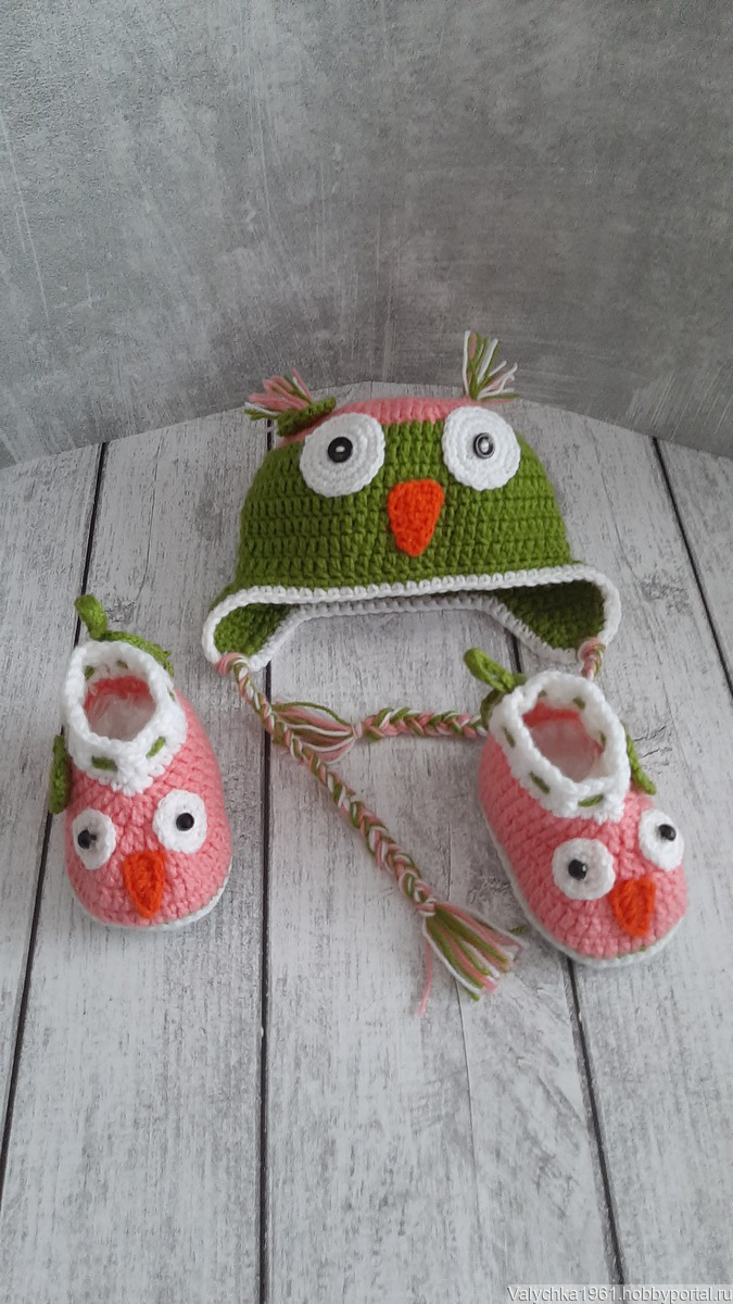 Вязанный крючком комплект шапочка+ пинетки. Для малышей от 0-6 месяцев.