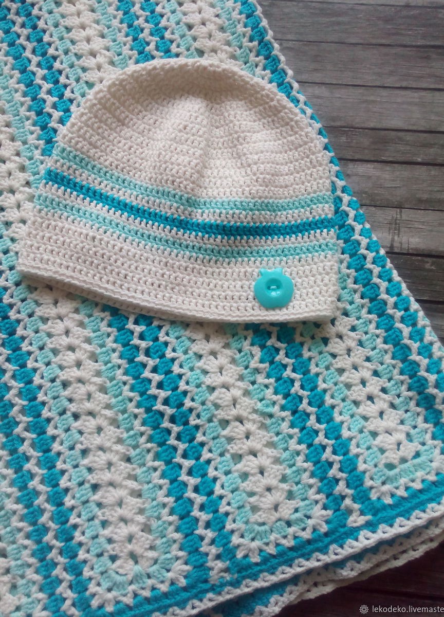 Маленькие шапочки для самых маленьких лялечек., можно для недоношенных. Белая шапочка с малиновыми цветочками на обхват 30 см, белая с голубыми и бирюзовыми полосками на 34 см. Так же имеется в наличии плед размер 88*84, цена пледа 1800. Хорош для подарка, на выписку. Связан из 100% хлопка, крючком