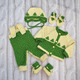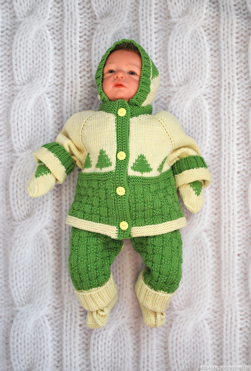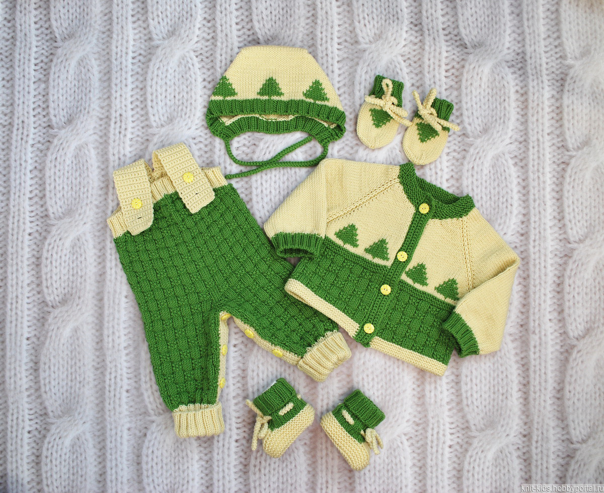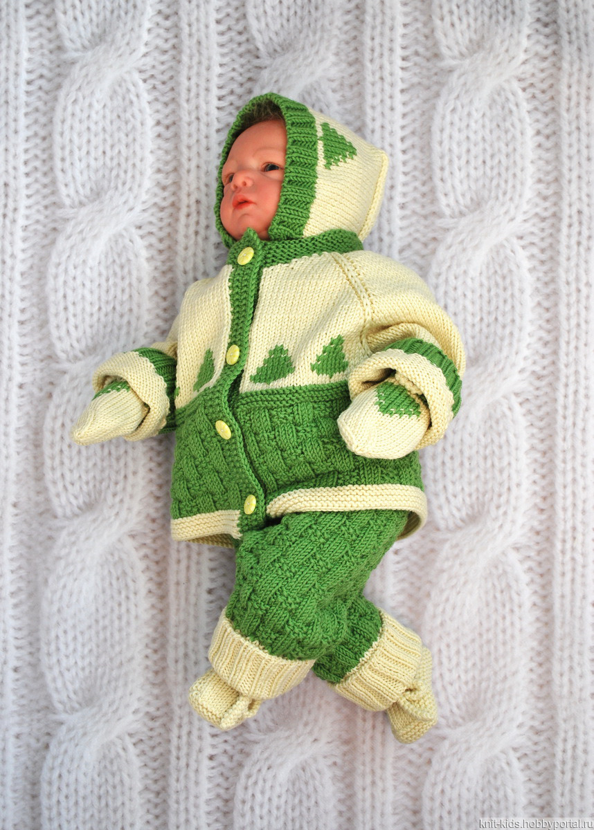 Комплект для новорожденного связан из итальянской пряжи, 100%-ный меринос с обработкой экстрафайн, идеально для новорожденных. Очень мягкая, можно малышу в качестве термобелья носить. В комплекте пинетки, варежки-антицарапки, шапочка-чепчик, кофточка и штанишки. Комплект украшен ручной вышивкой в виде ёлочек.