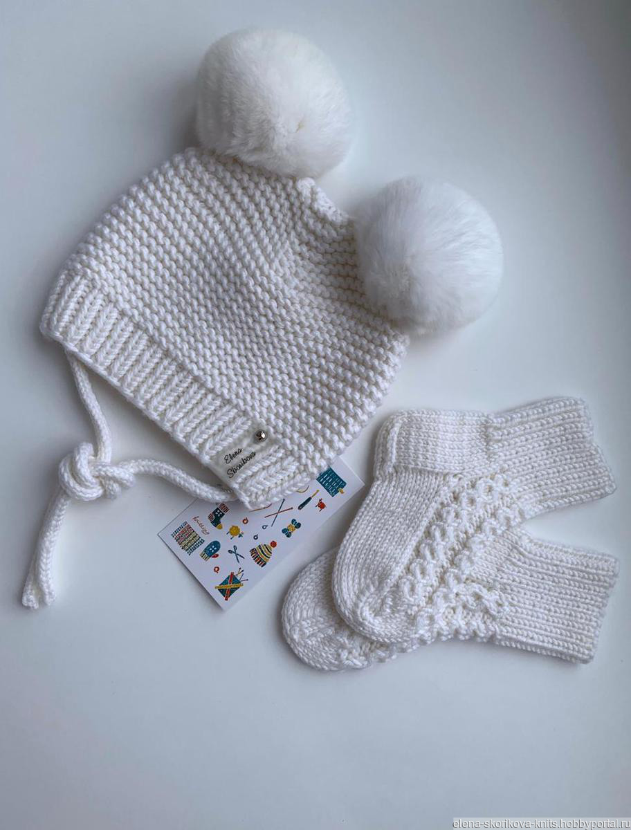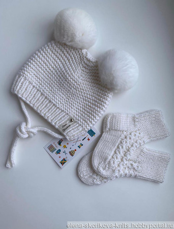 Зимняя шапочка связана из 100% итальянского мериноса в 2 нити. Помпоны - кролик, Размер - 40-42. Носочки связаны из 100% итальянского мериноса, длина стопы - 11 см.