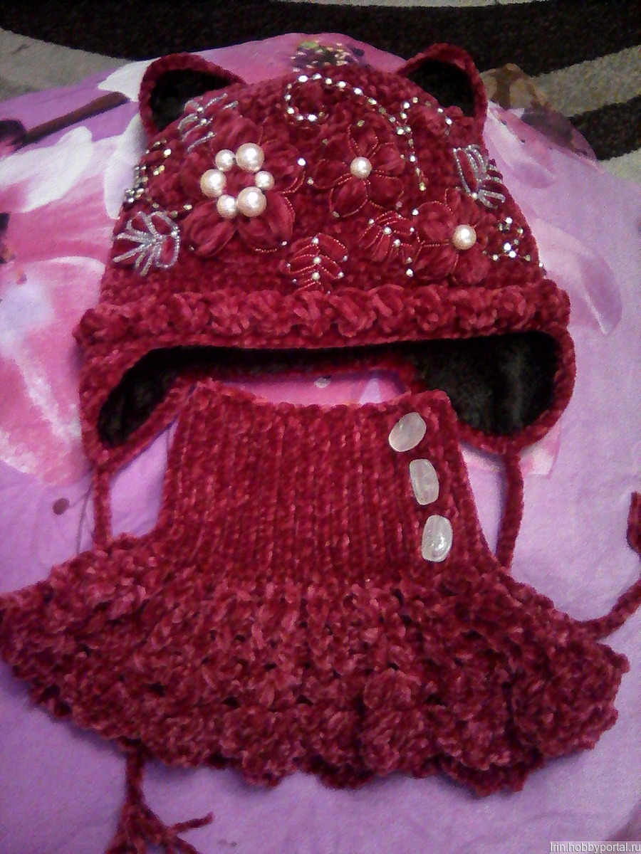 Шапочка с объемной вышивкой и манишка .цвет спелая вишня.поклад-иск.мех