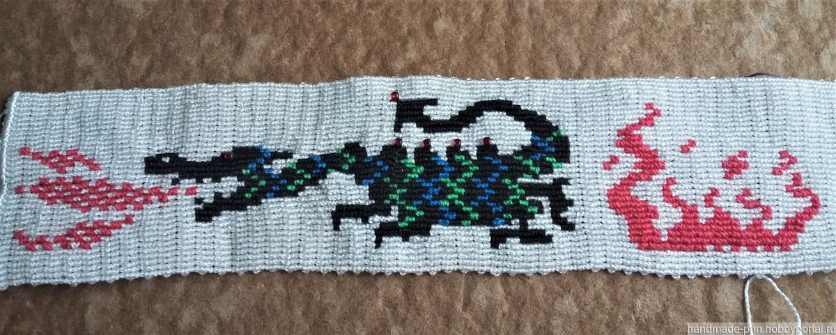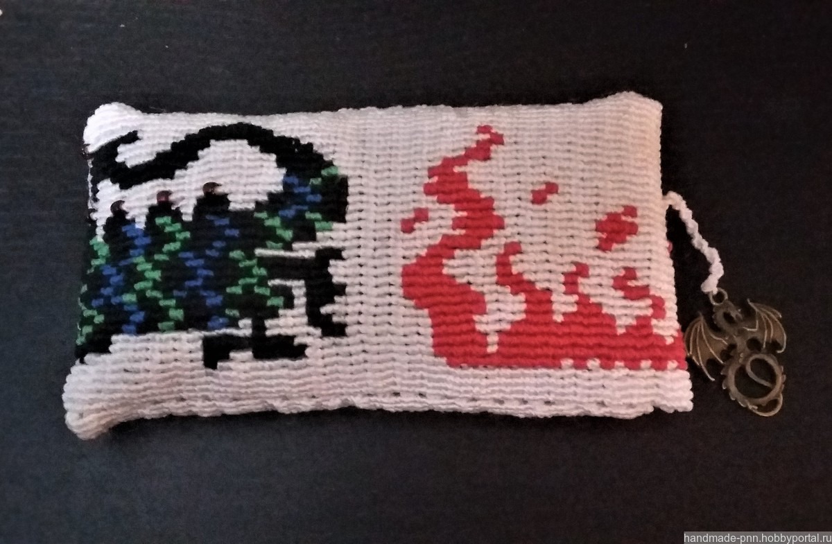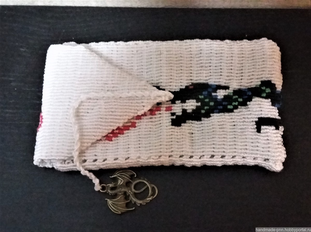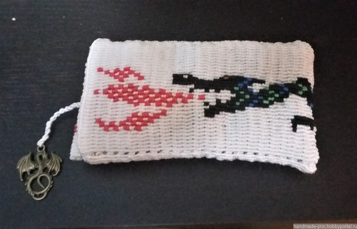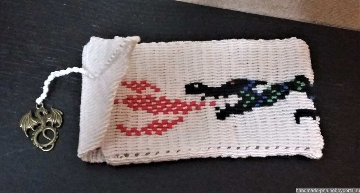 Чехол для телефона выполнен в технике макраме из синтетической полиэфирной нити белого цвета. На чехле выполнен рисунок дракона извергающего пламя. Закрывается при помощи носика, вдвигающегося внутрь чехла. Для открытия необходимо потянуть за металлический кулон дракона.
