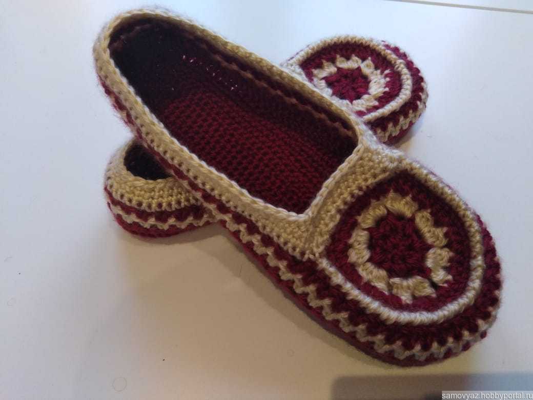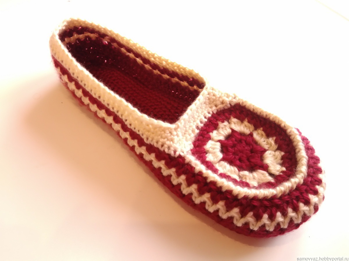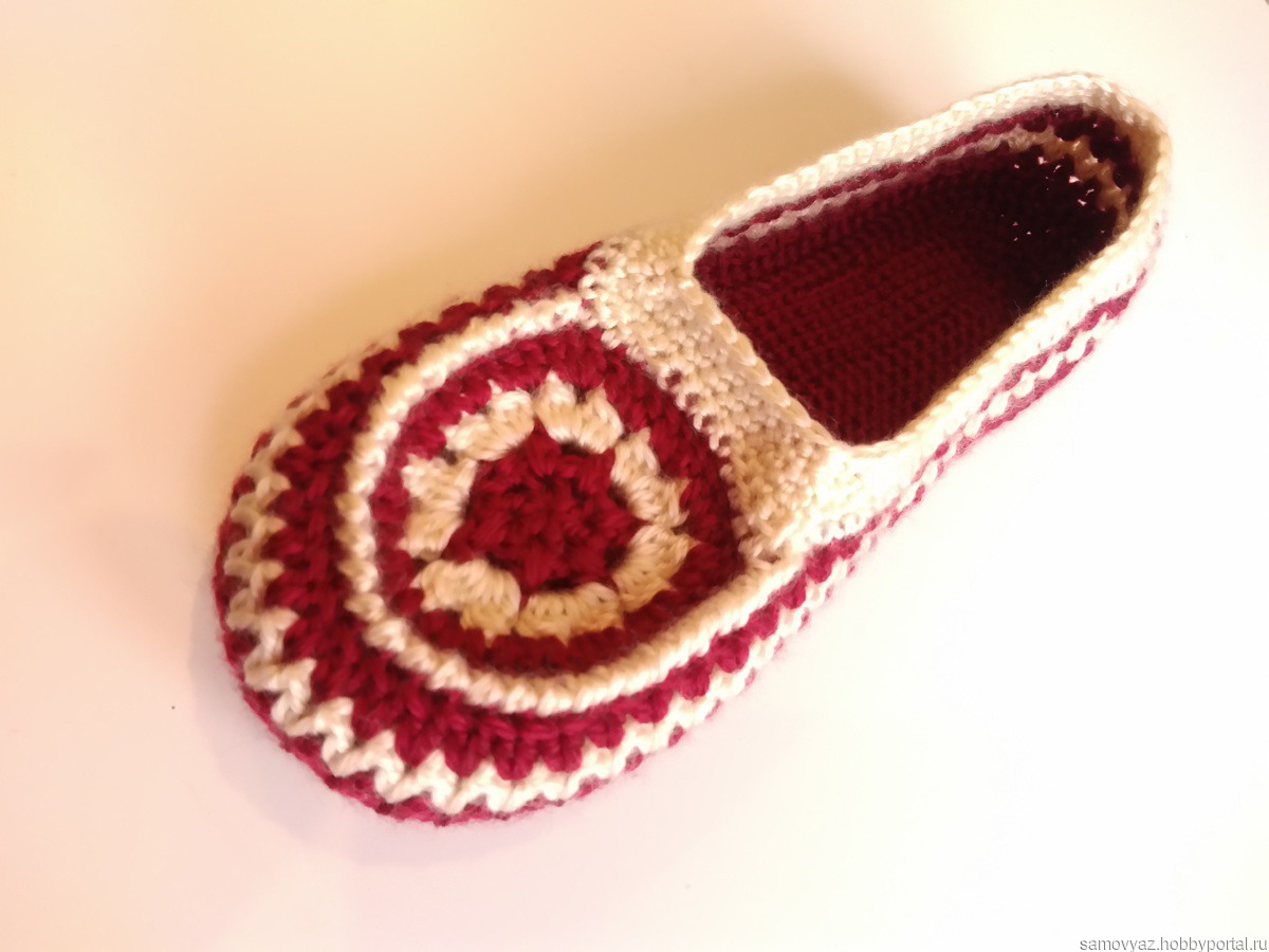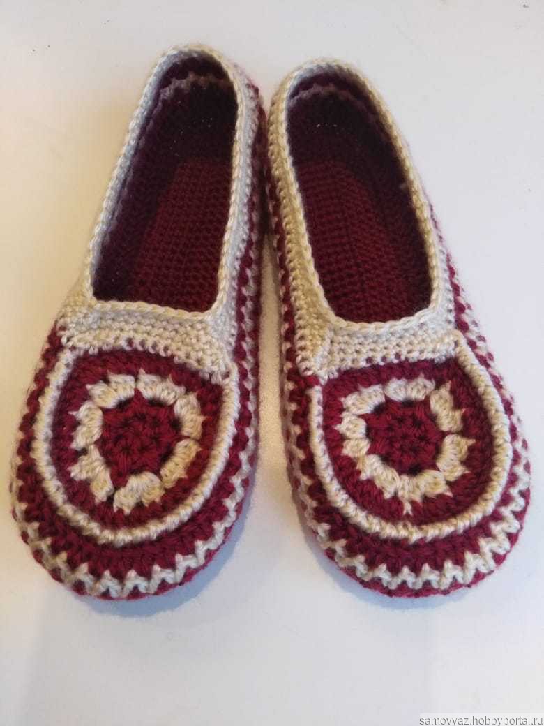 Следочки, связанные крючком из полиэстра. Мягкие, уютные, комфортные, отличная замена домашним тапочкам. Не деформируются при стирке. Размер 38-39, цвет - бордовый/кремовый.. При заказе возможно исполнение в другом цвете, любого размера.