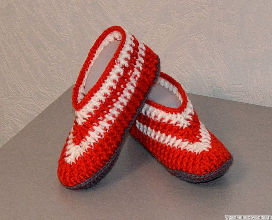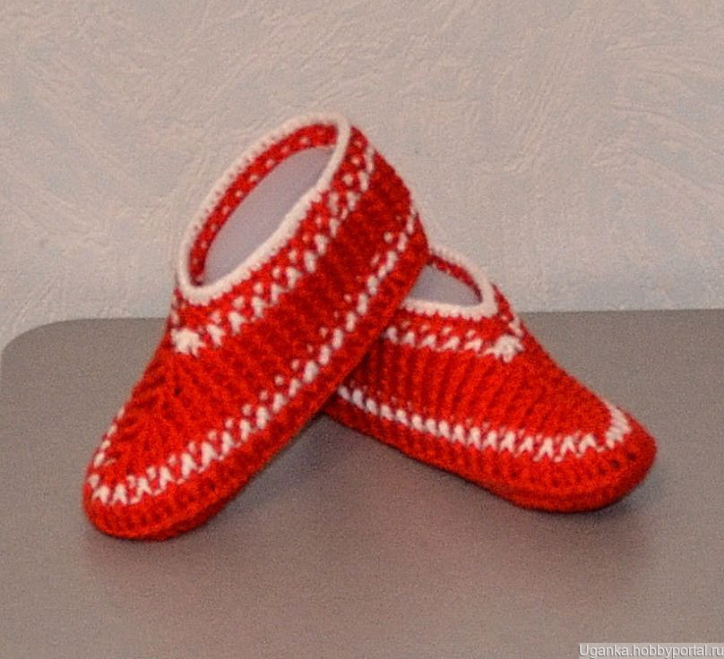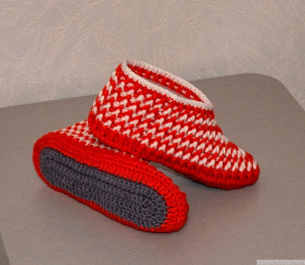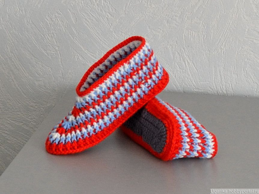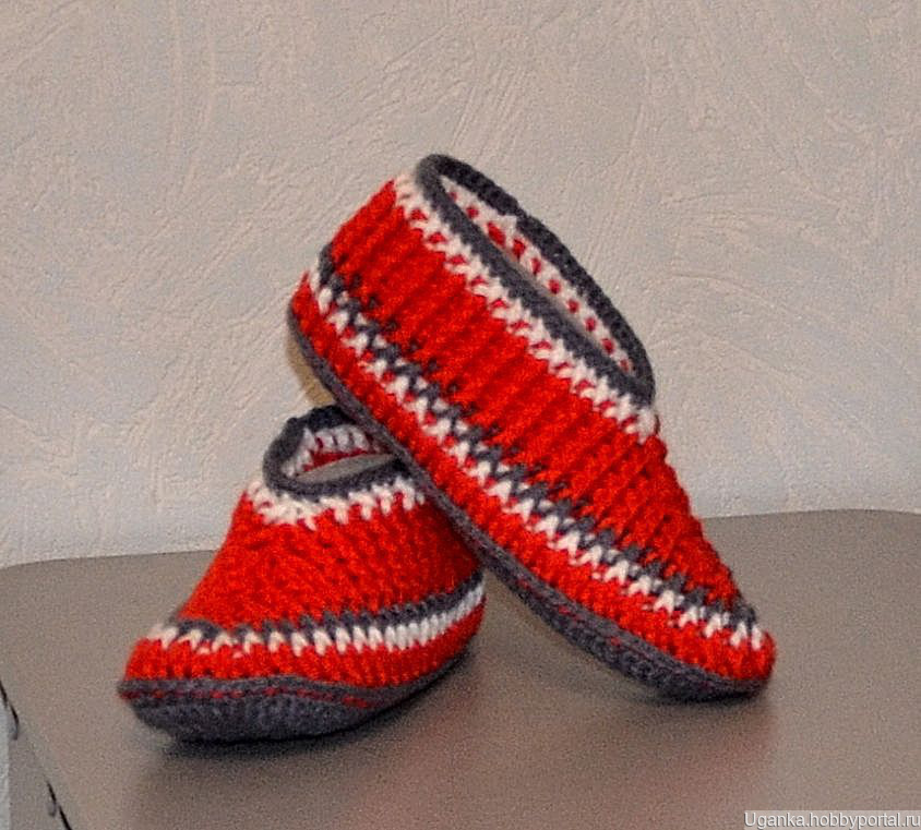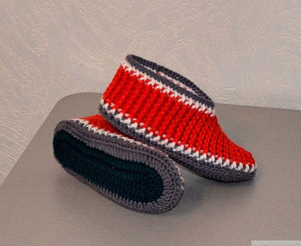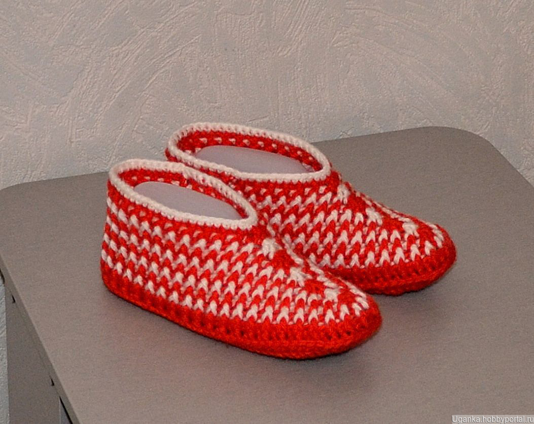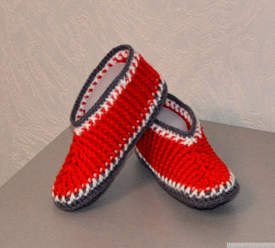 Тапочки-носочки вязаные крючком. Верх тапочек достаточной ширины (так называемый анатомический). Материал - трехниточный акрил шерстяного типа, поэтому в носке показали себя хорошо. При заказе от 3 пар цена 350 руб. Основной цвет красный.