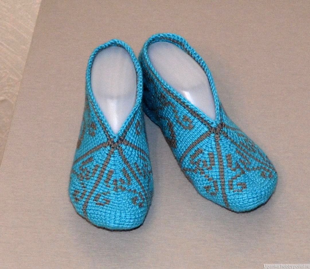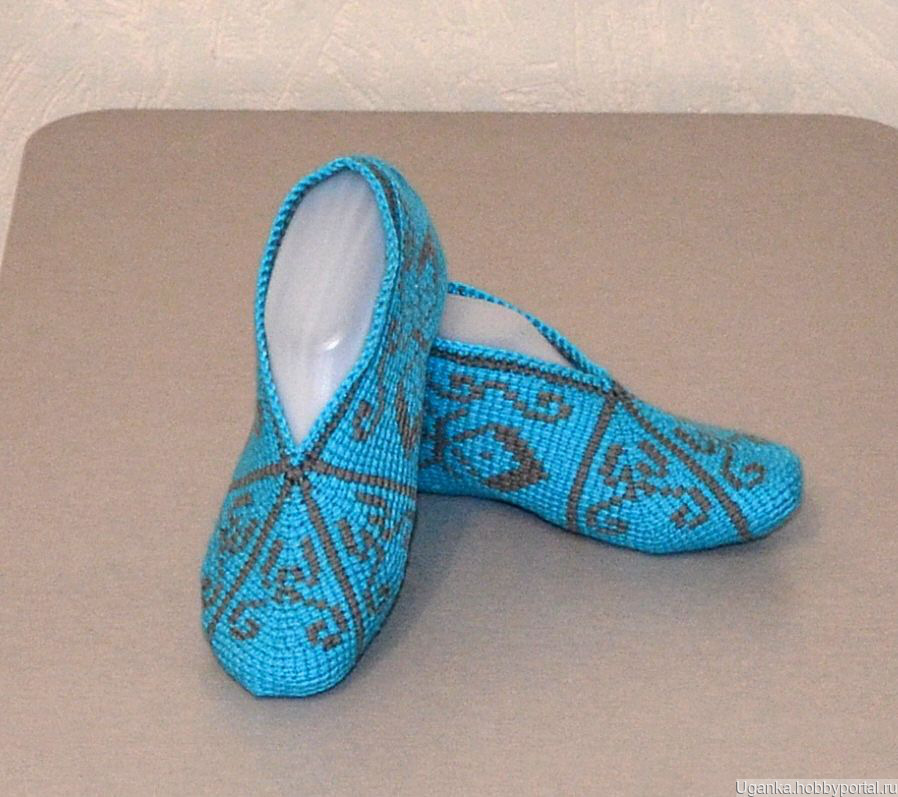 Тапочки-следочки связанные тунисским крючком. В составе пряжи 25% натуральная шерсть.