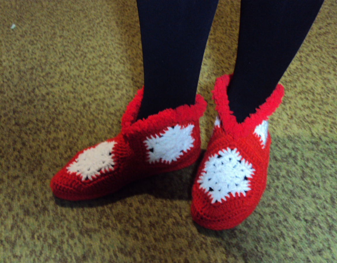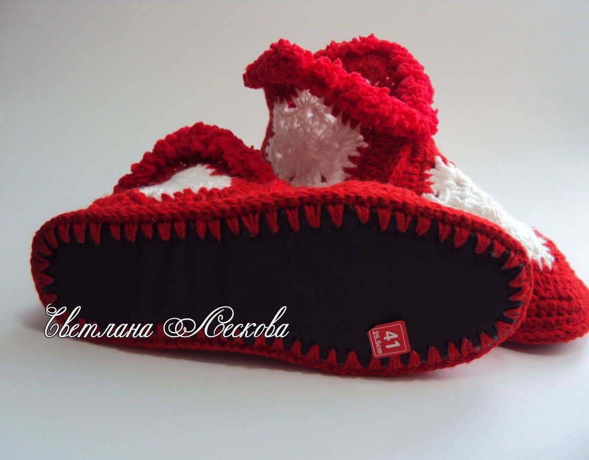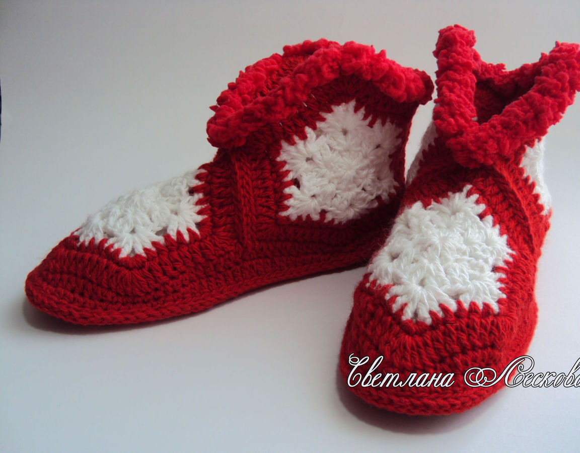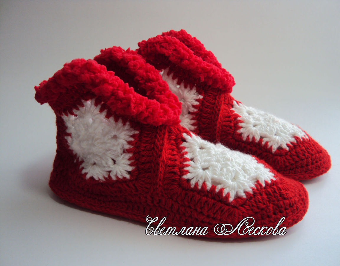 белый, красный, тапочки, тапочки крючком, снежинки, тапочки домашние, купить подарок, тапочки вязаные, купить, тапочки-сапожки